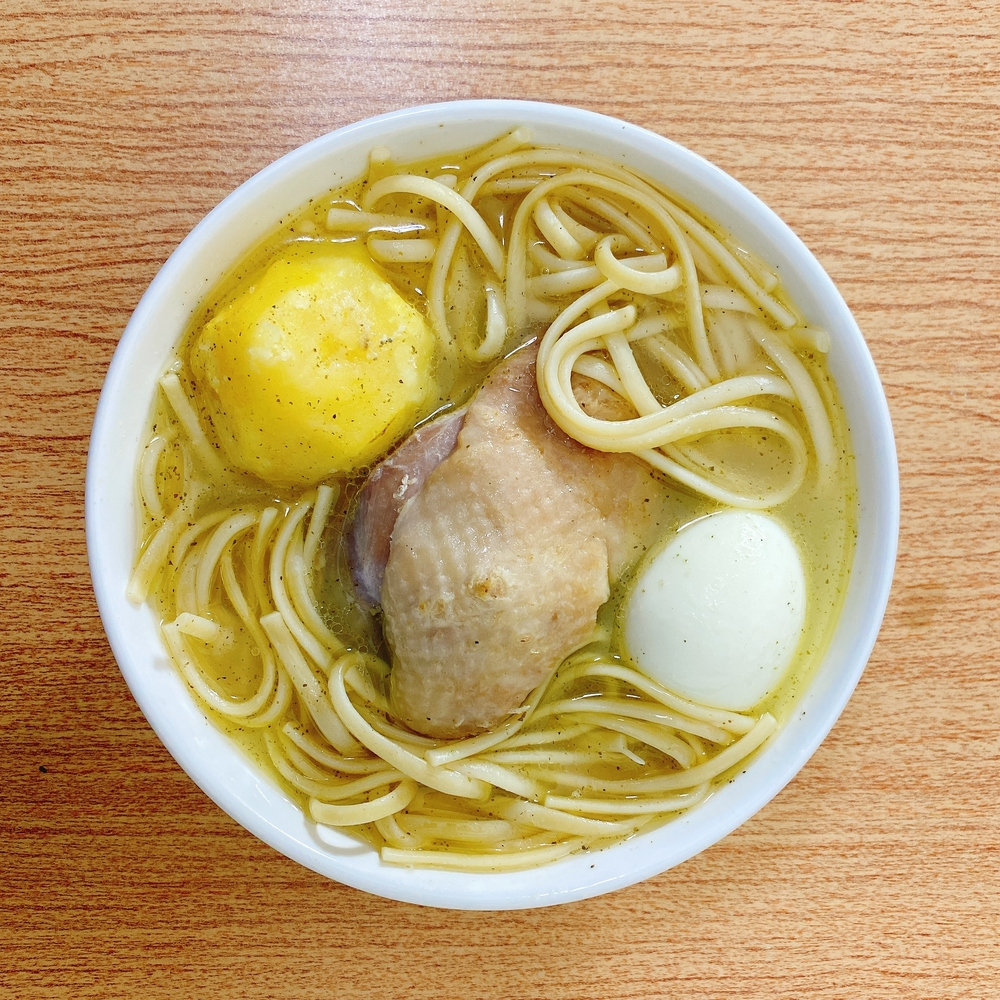 Caldo de gallina, huevo, papa, fideos