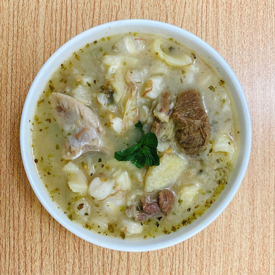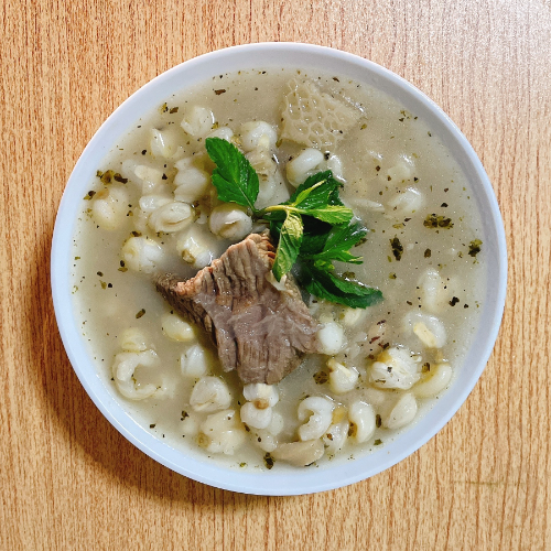 Sopa a base de carne de res, mote pelado, pata de res, mondongo y hierbabuena