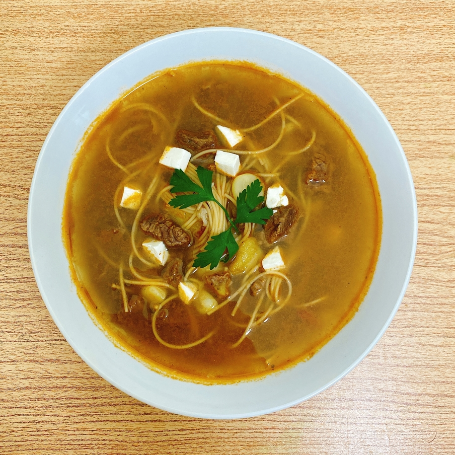 Sopa de carne de res, cabello de ángel, leche, huevo frito y aderezo especial
