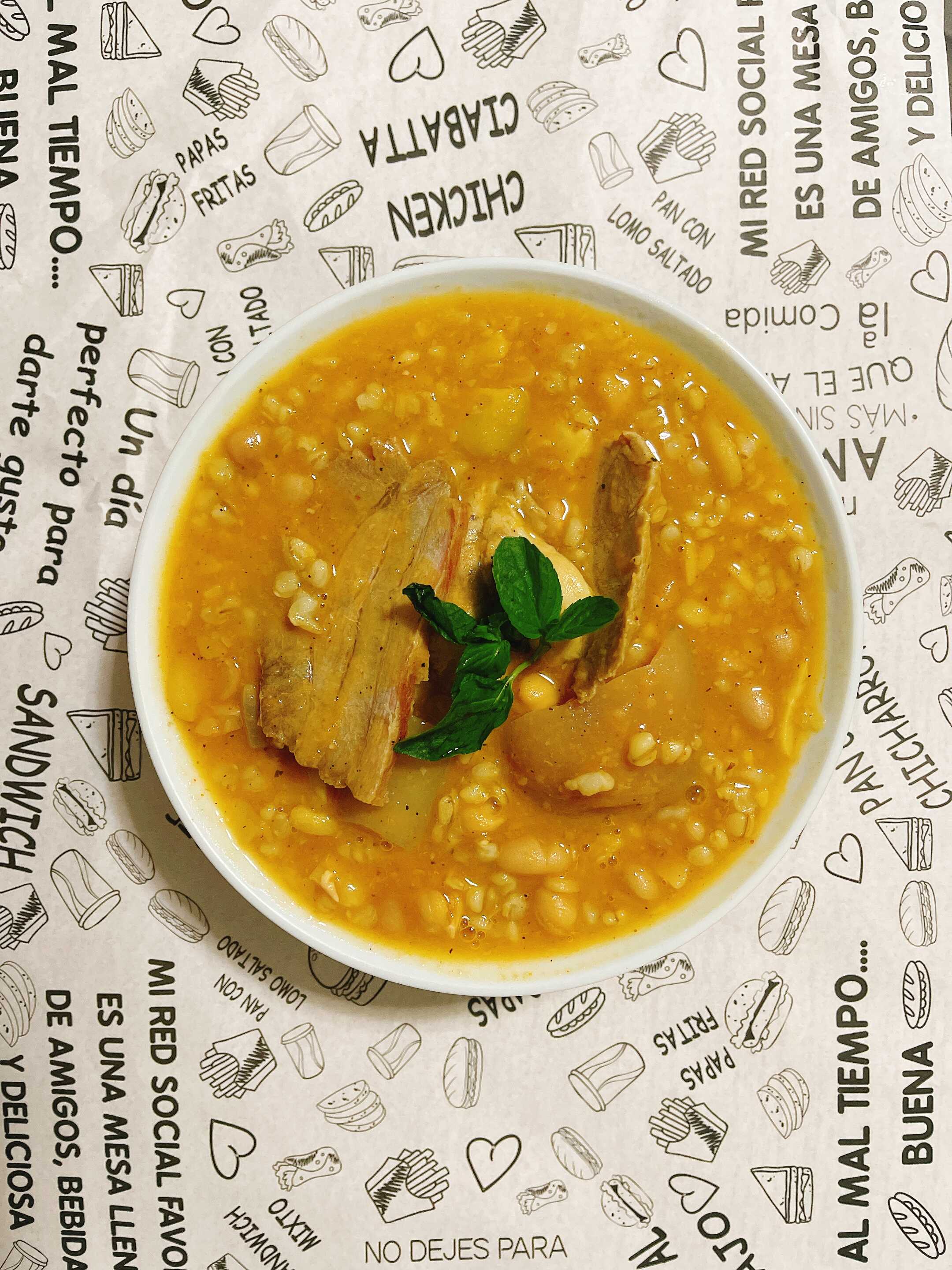 Sopa hecha a base de menestras (trigo, frijol, habas y garbanzo), carne de cerdo y panceta.