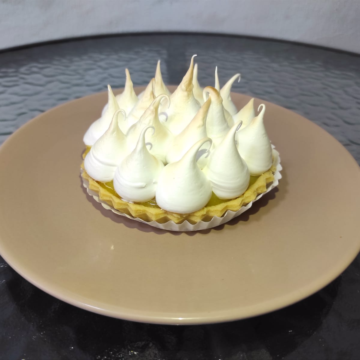 Pie relleno de crema de limón y decorado con merengue italiano.