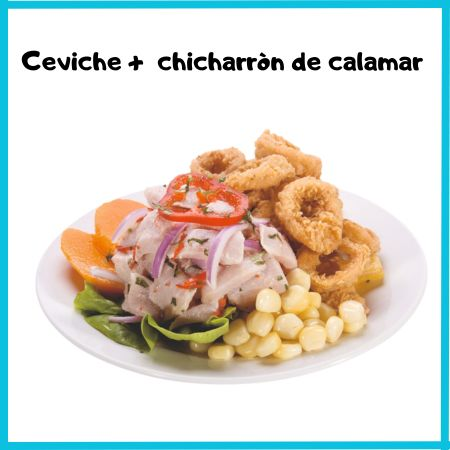 Delicioso ceviche + arroz con mariscos + chicharrón de pota + chilcano+ vaso de chicha o maracuya.