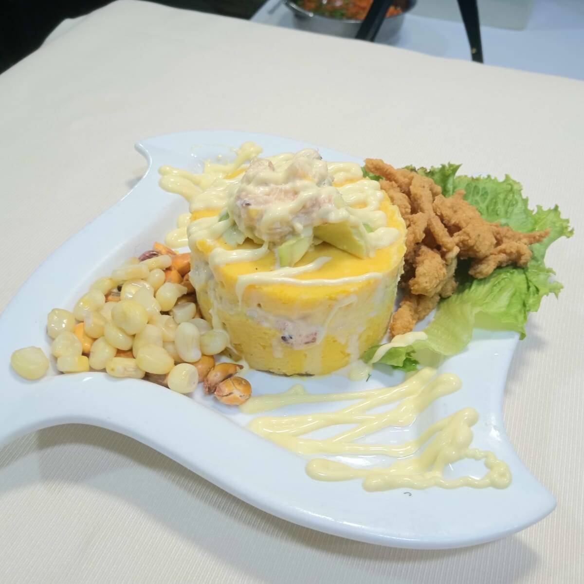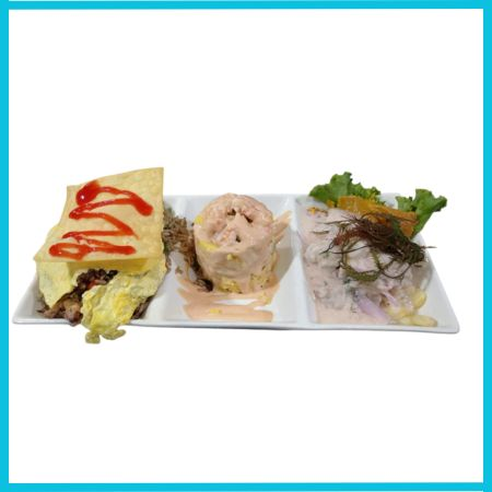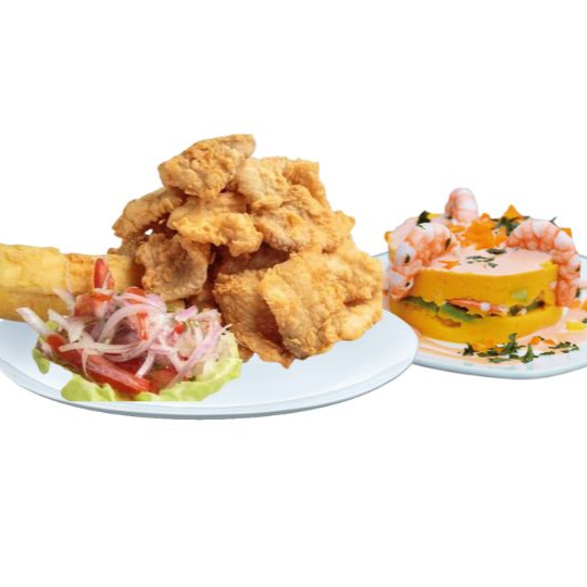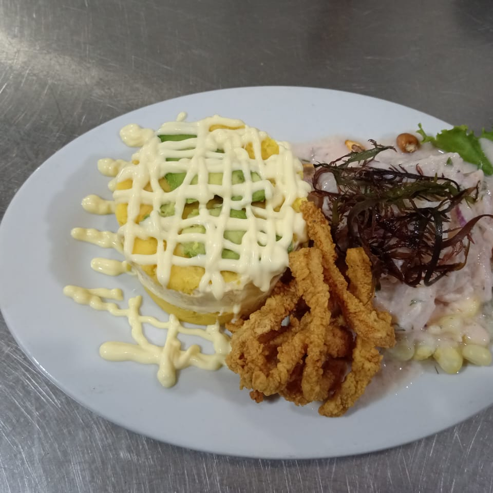 Deliciosa causa de langostinos+ chicharrón de pescado + ceviche de pescado.