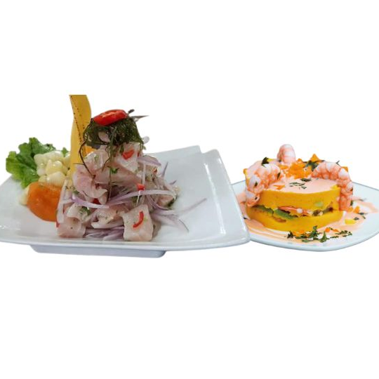ceviche de pescado + causa de langostinos