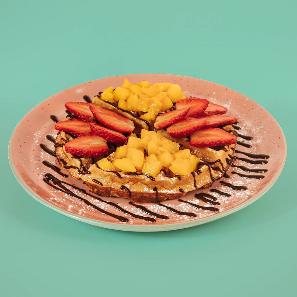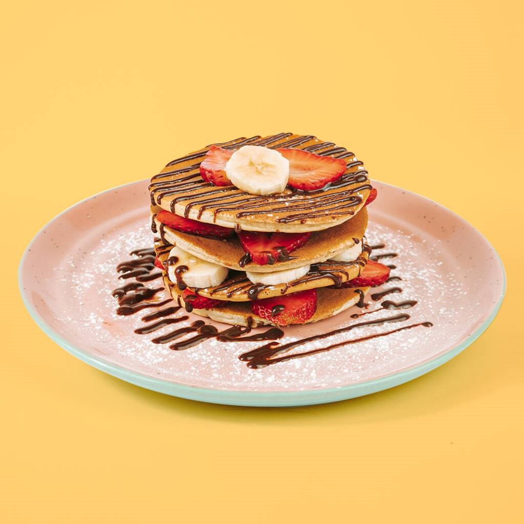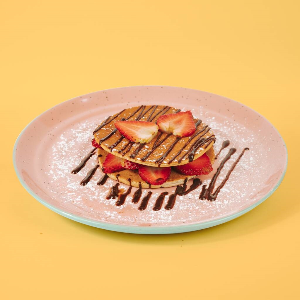 4 Hotcakes, mantequilla, 1 jalea y 2 frutas.