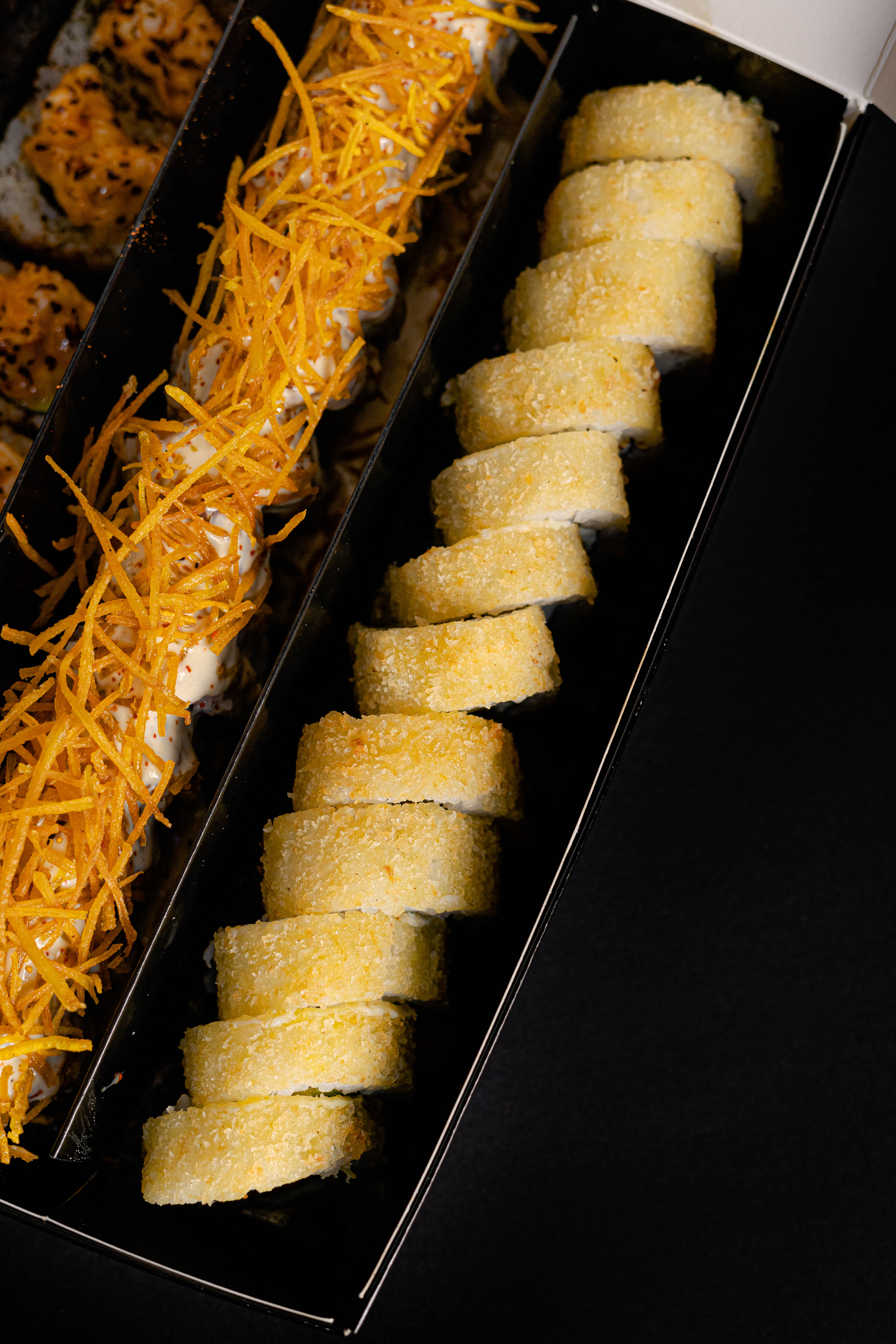 Langostino empanizado y palta, cubierto de tartar de salmón con un toque picante, quinua negra, cebolla china y salsa anguila.