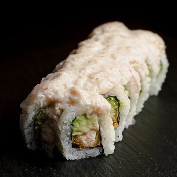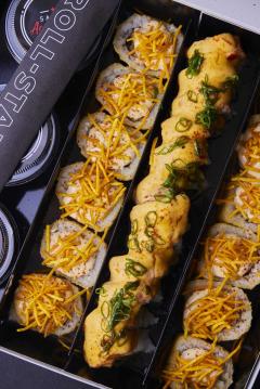 Langostino empanizado, queso crema y palta, bañado en togarashi, flameado en salsa de quesos.