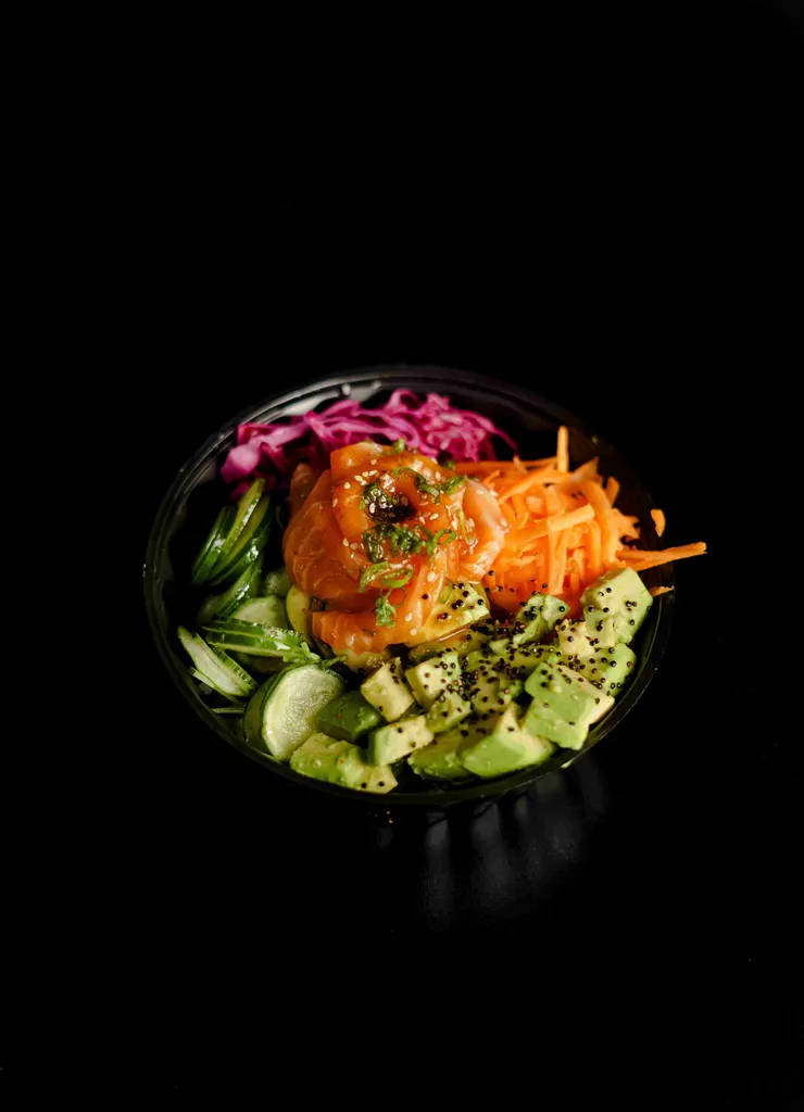 Poke con salmón, shari, mango, zanahoria, palta, col morada, tamaño a elección.