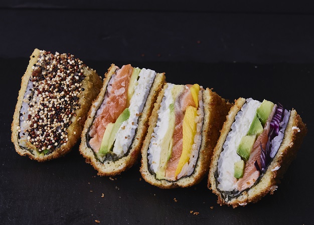 Sándwich empanizado, frito de shari con alga nori, salmón, palta, queso crema y col morada.