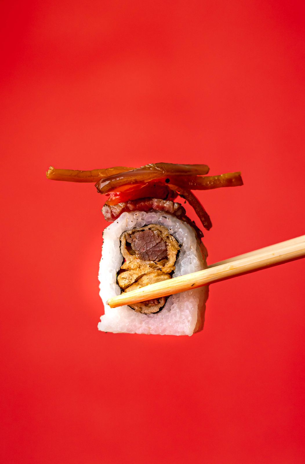 Lomo tempura, cubierto con lomo fino sellado en salsa de ostión y nuestro clásico salteado.
