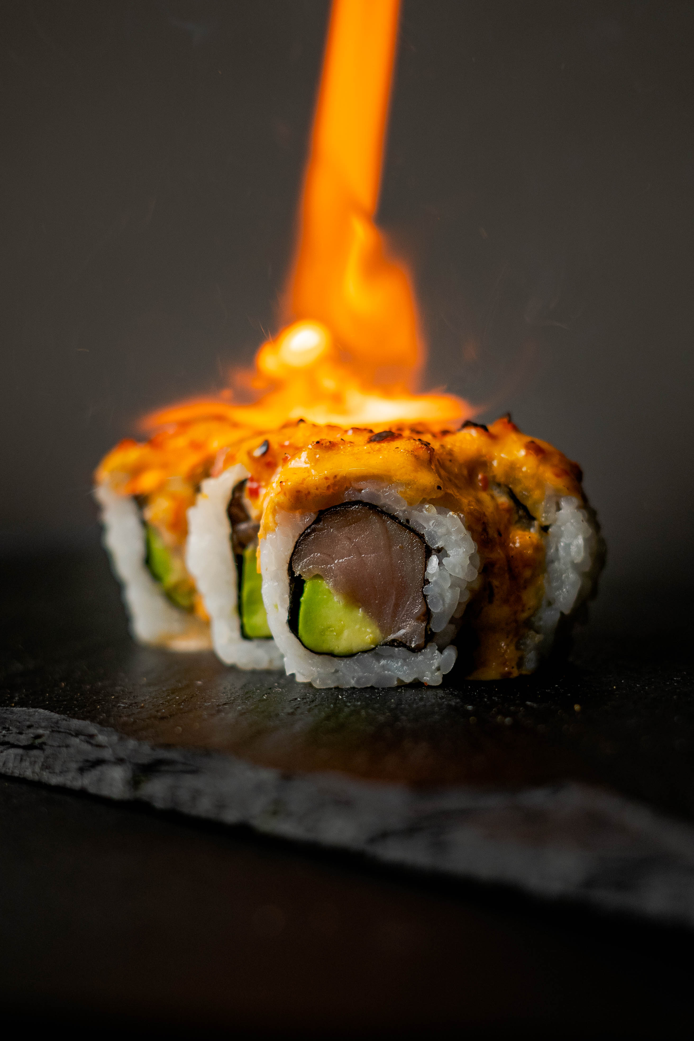 Langostino empanizado, queso crema y palta, bañado en togarashi, flameado en salsa de quesos.