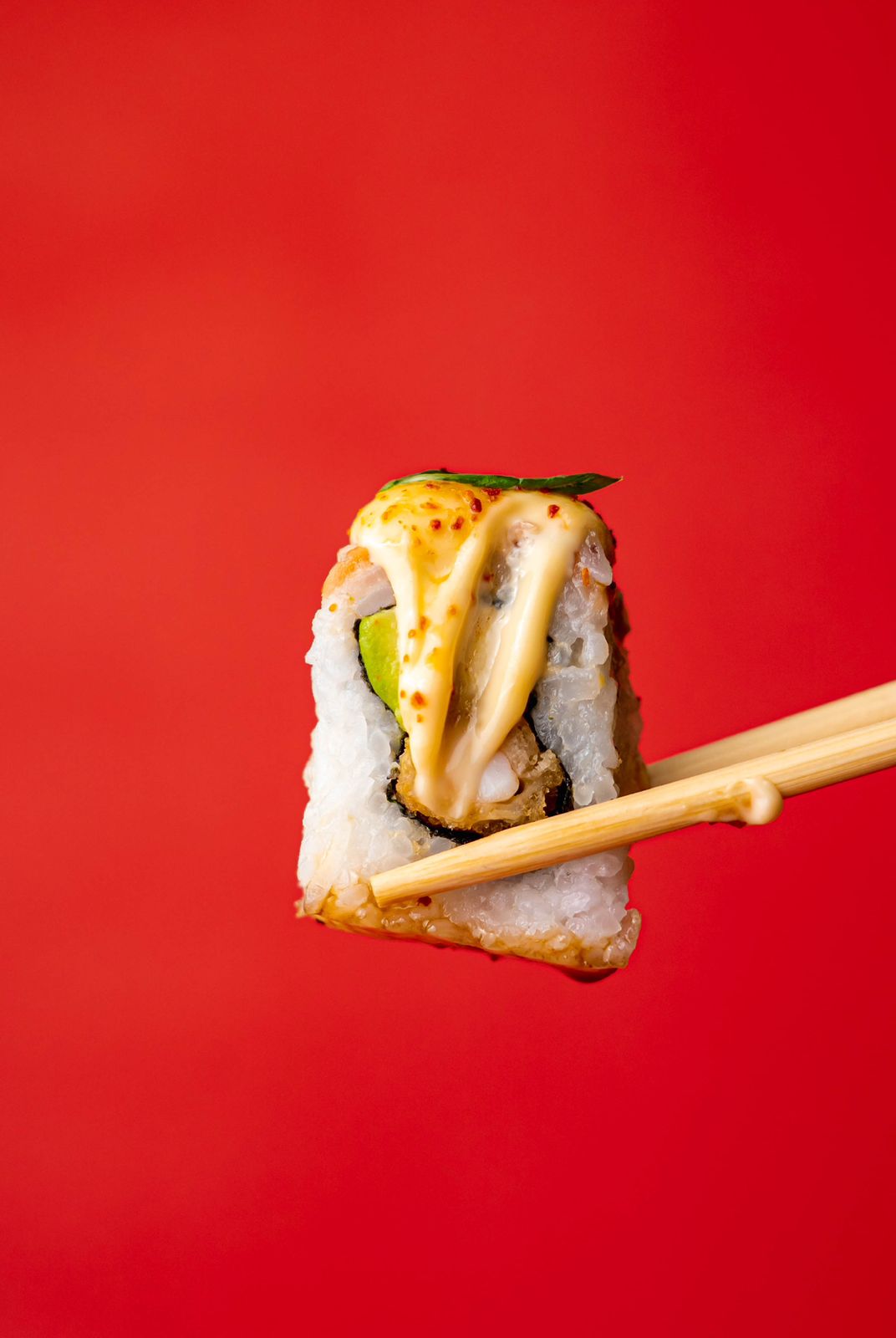 Palta y pescado, cubierto con salsa spicy y pulpa de cangrejo.