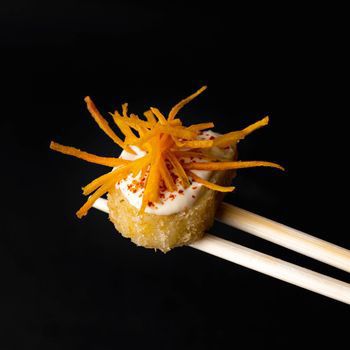 Pescado empanizado, palta y queso crema frito en panko, cubierto de salsa acevichada espolvoreada con togarashi y hilos de camote.