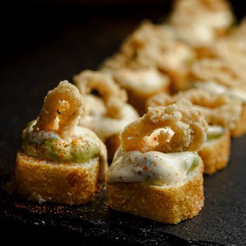 Pescado empanizado, palta y queso crema cubierto de guacamole, aros de calamar salsa acevichada y togarashi.