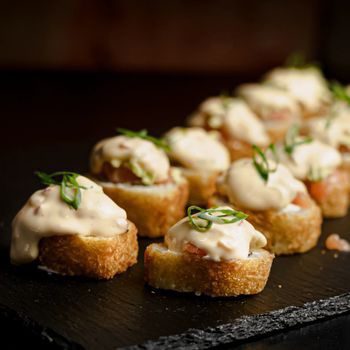 Langostino empanizado y palta, cubierto de tartar de salmón con un toque picante, quinua negra, cebolla china y salsa anguila.