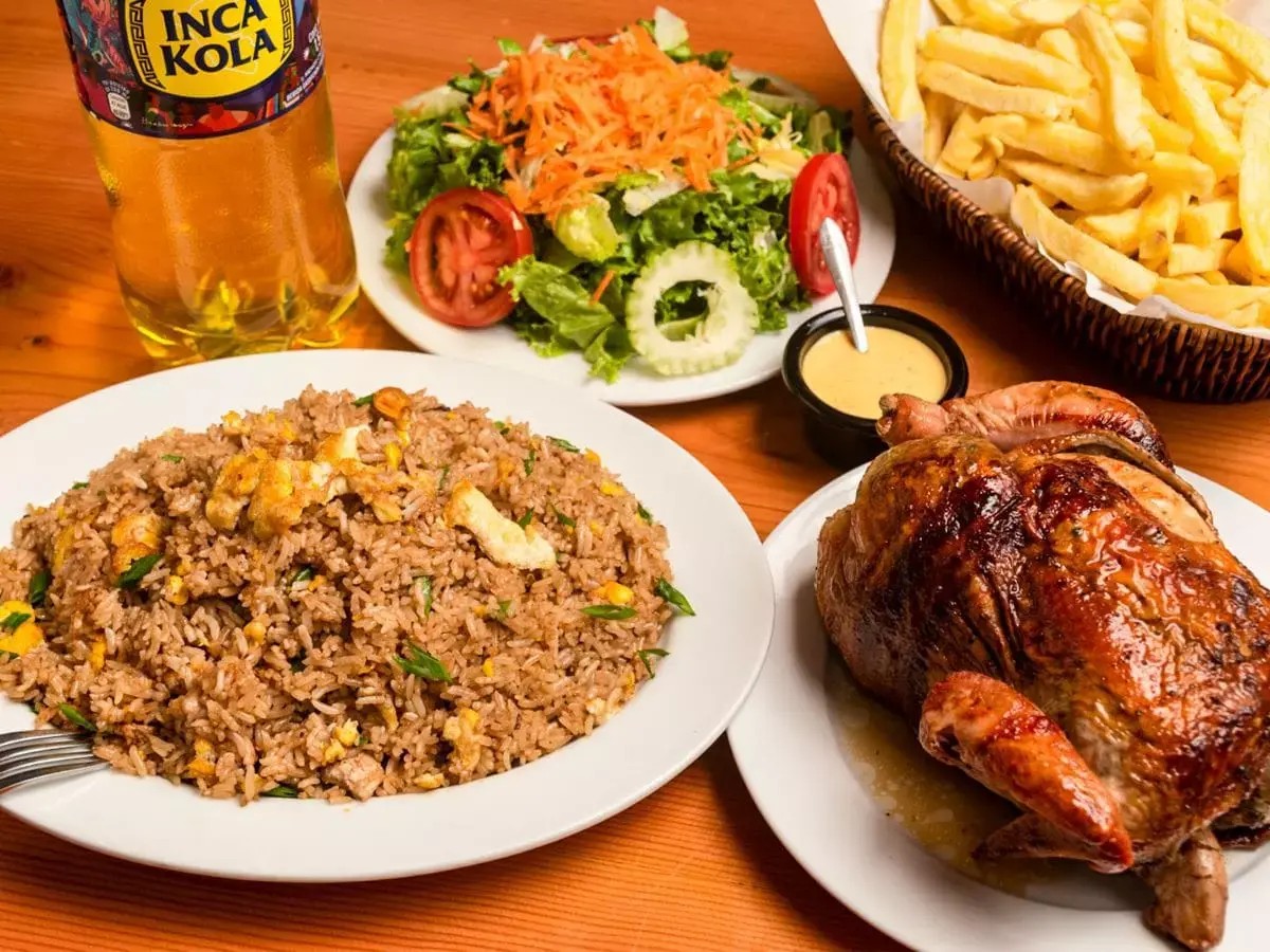 Arroz frito con cebolla china, sillao, trozos de huevo y pollo, pollo a la brasa.