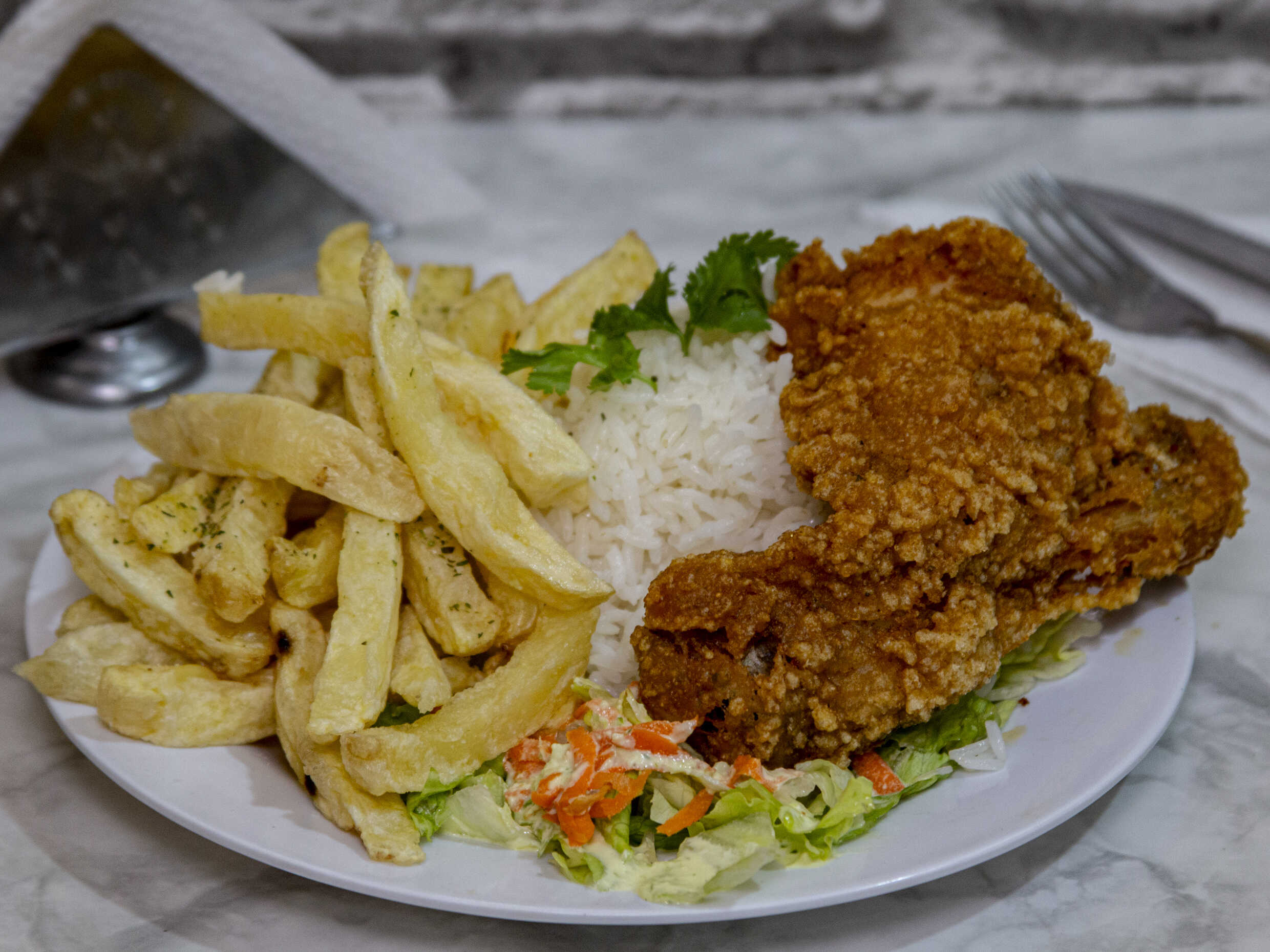 Entrepierna broaster con papas fritas, arroz blanco (opcional) y ensalada de la casa.