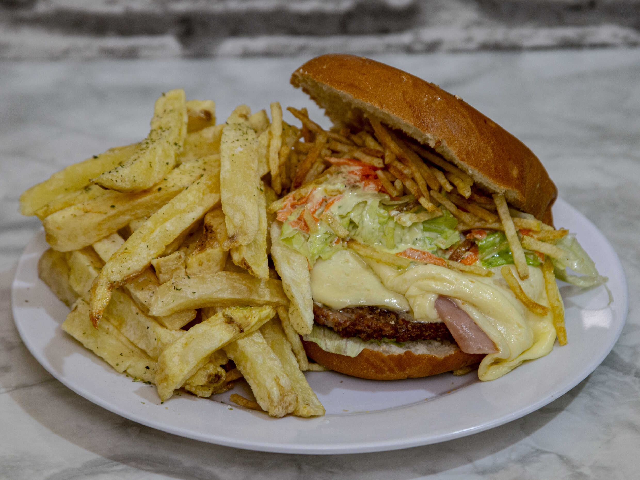 Hamburguesa junto al jamón con queso, papas al hilo y papas fritas extras, elige tú cremas.