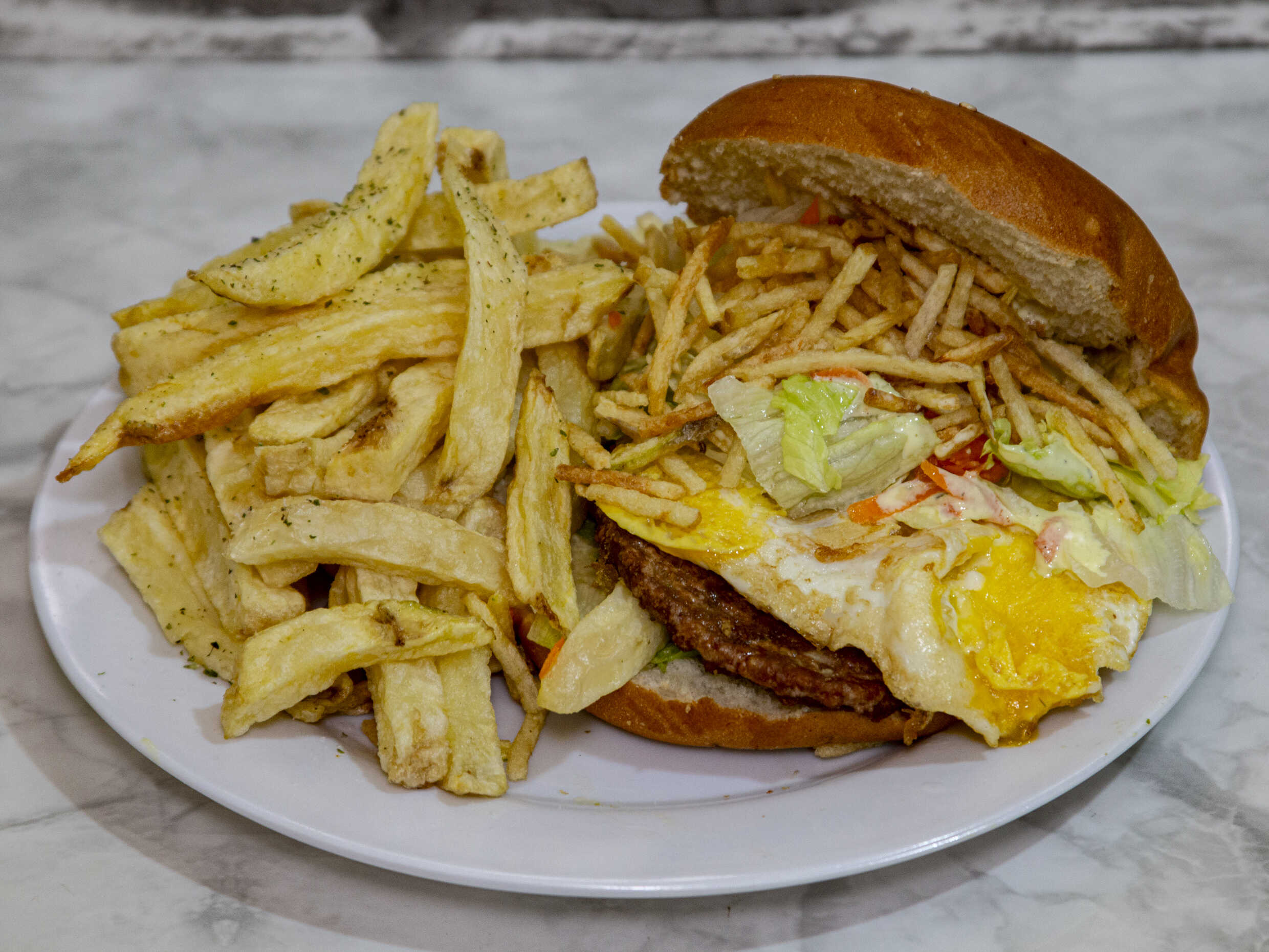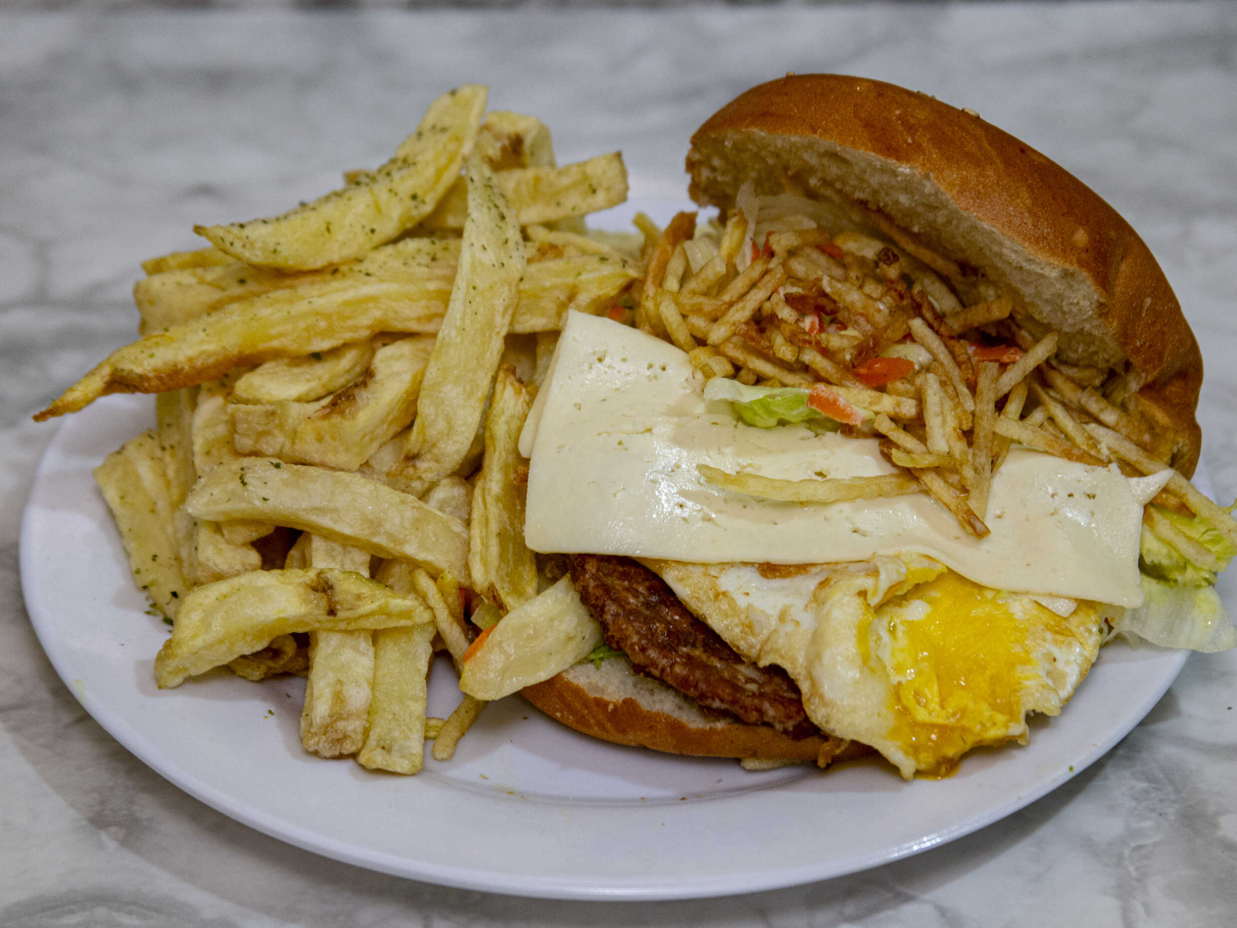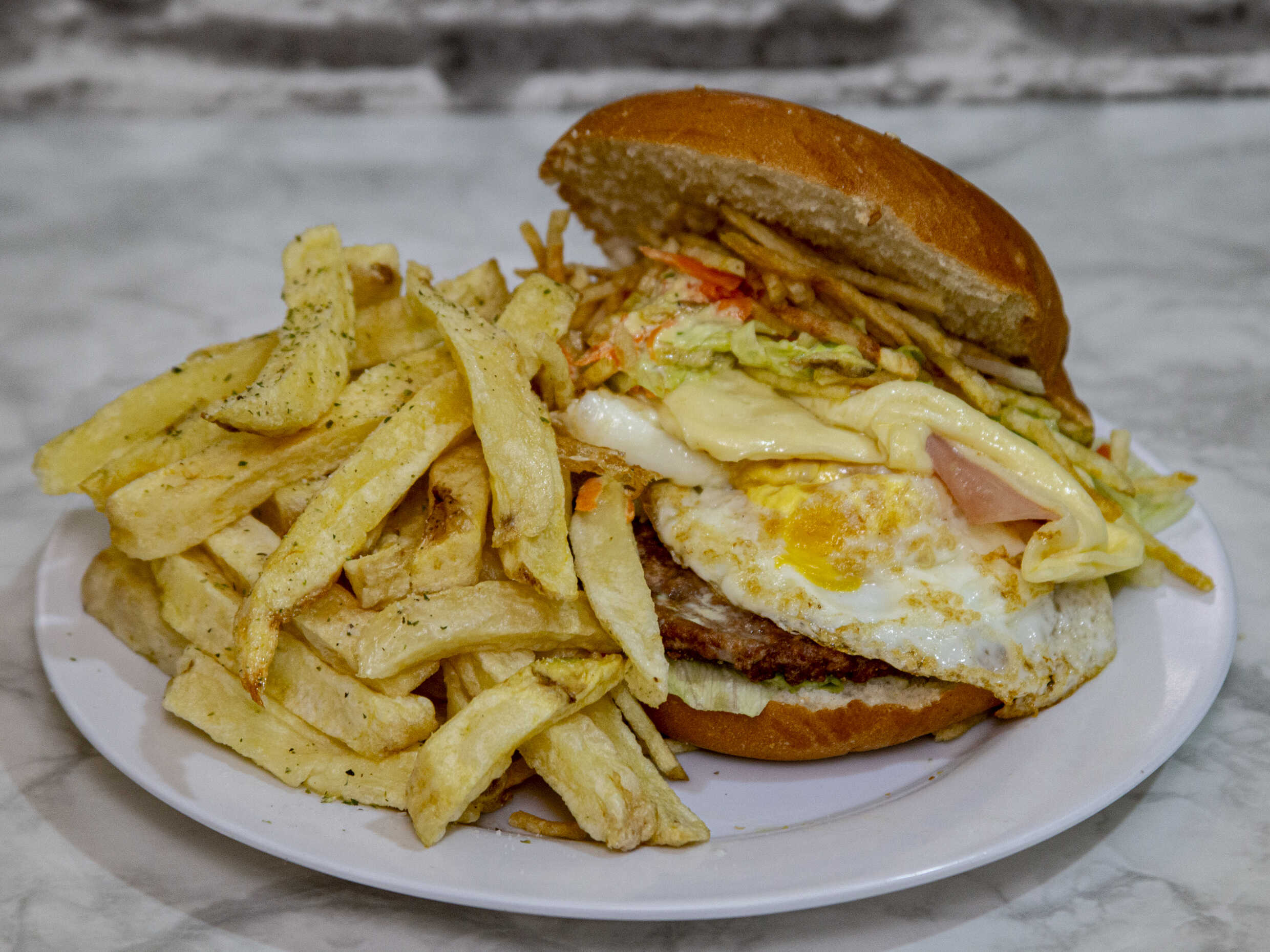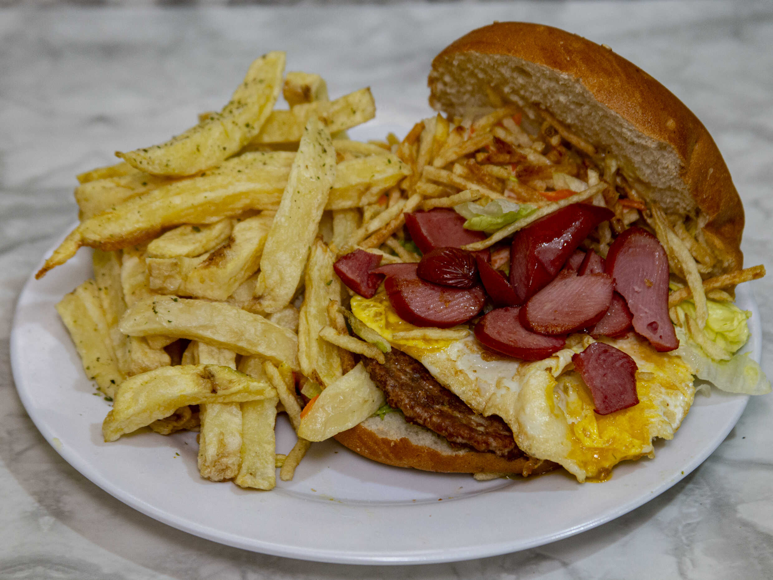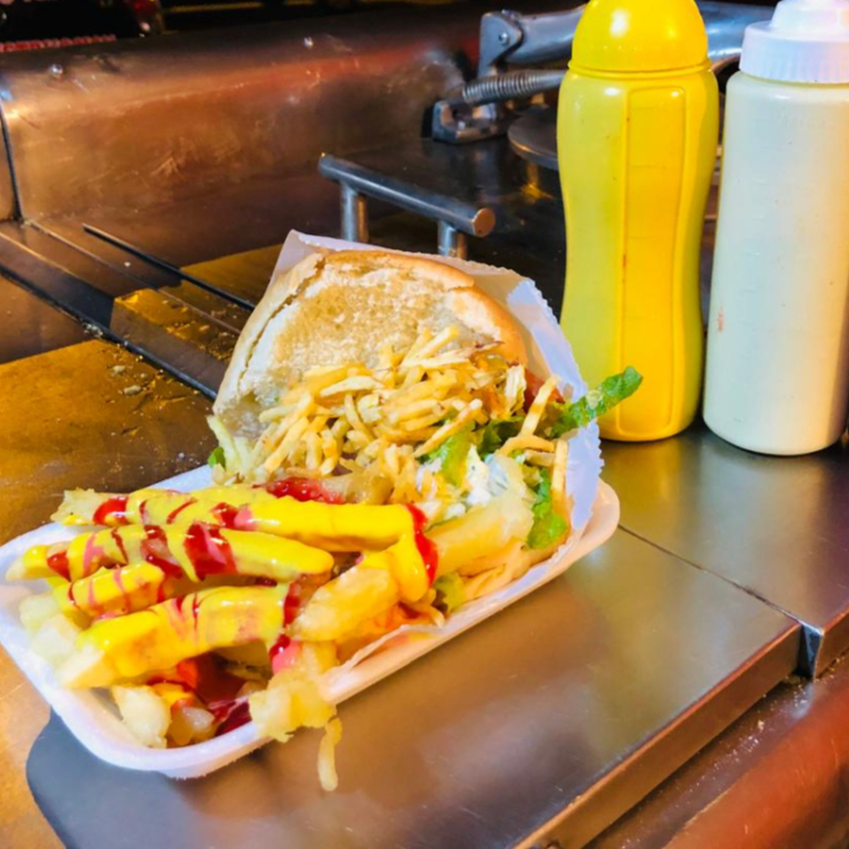 El clásico con huevo frito, papa al hilo y papas fritas extras, elige tú cremas.
