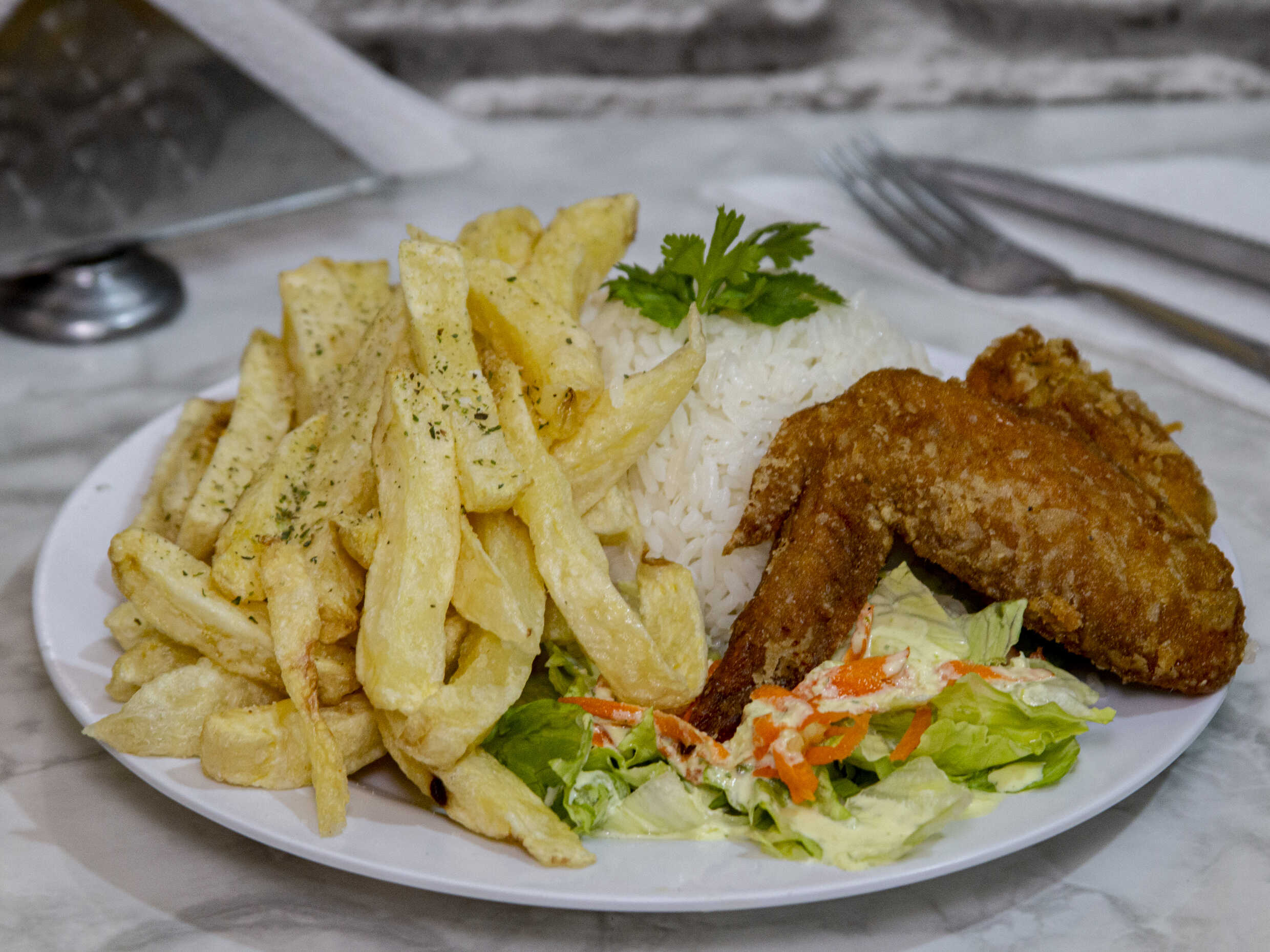 Alita broaster con papas fritas, arroz (opcional) y ensalada de la casa.
