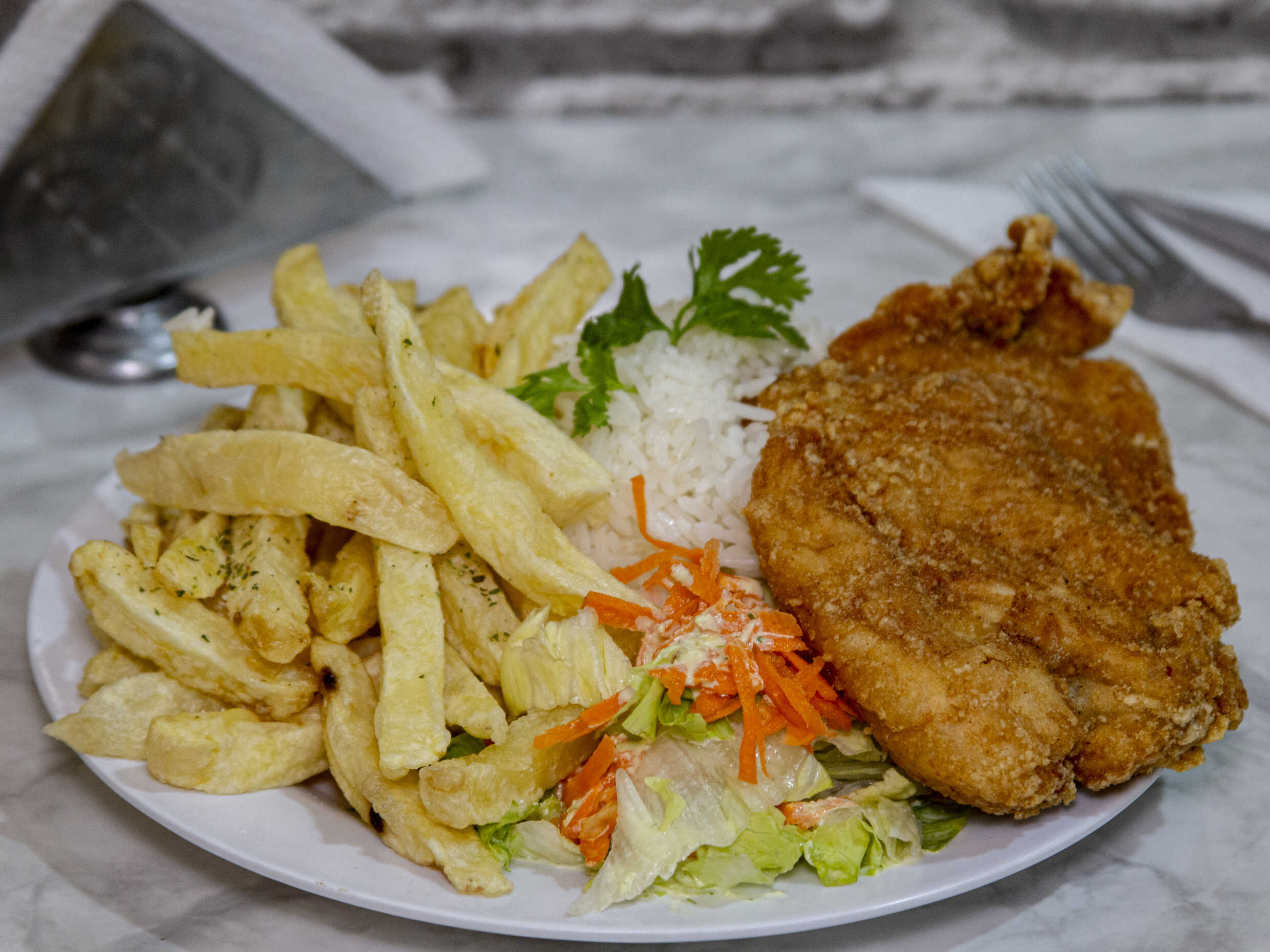 Pechuga broaster con papas fritas, arroz blanco (opcional) y ensalada de la casa.