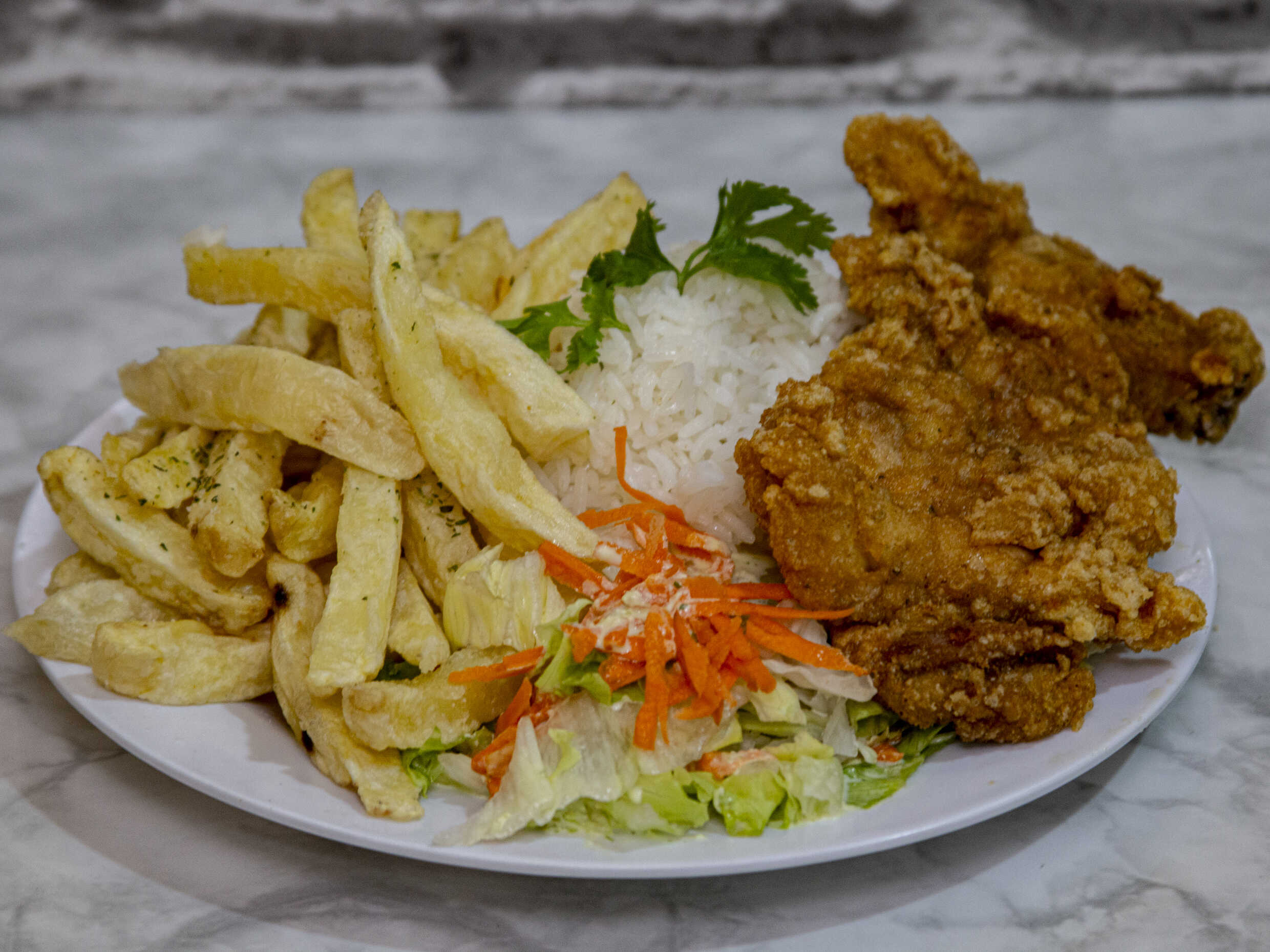Pierna broaster con papas fritas, arroz blanco (opcional) y ensalada de la casa.