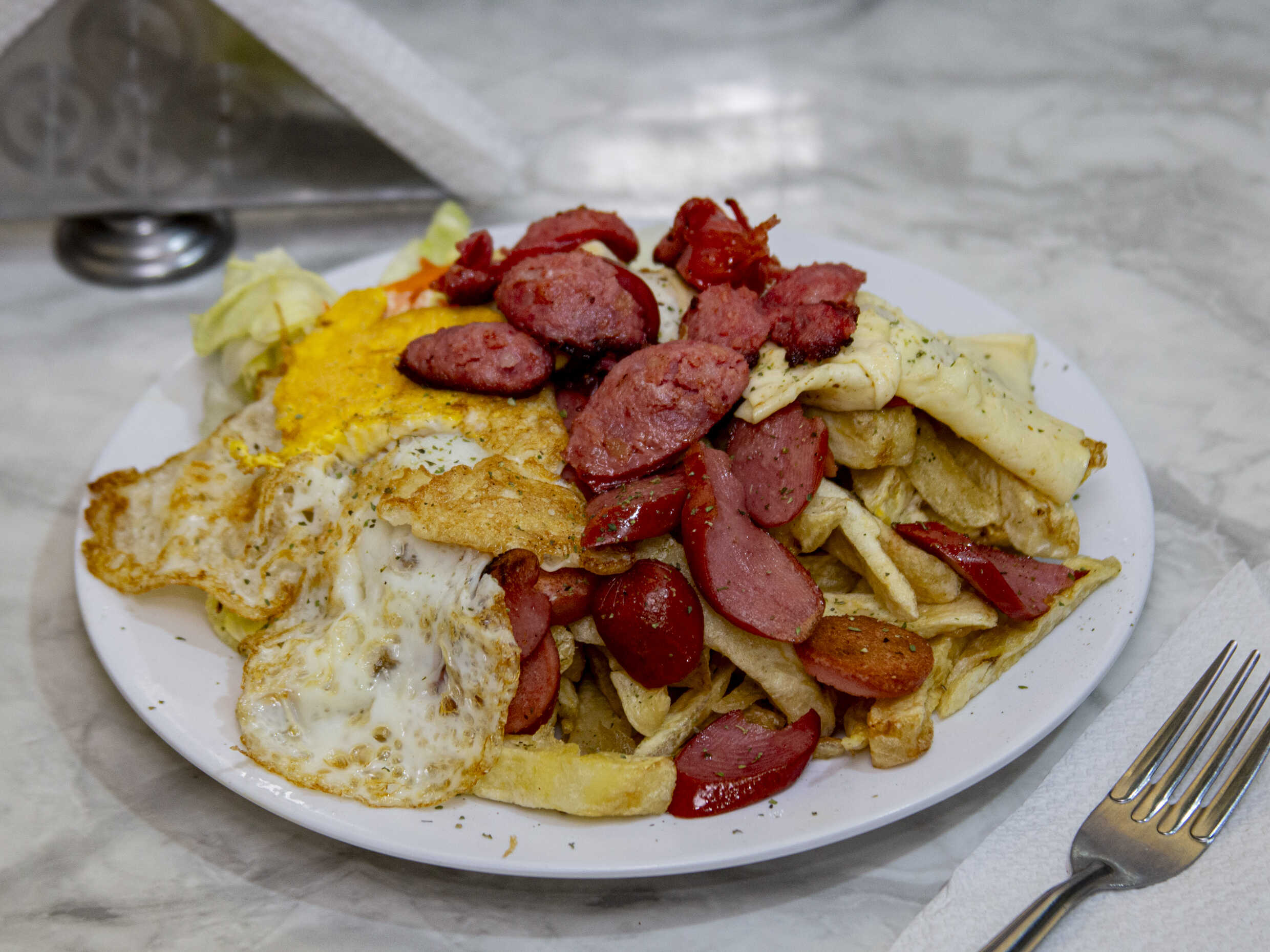 Con salchicha de ternera mixta, huevo frito, papas fritas y ensalada de la casa.