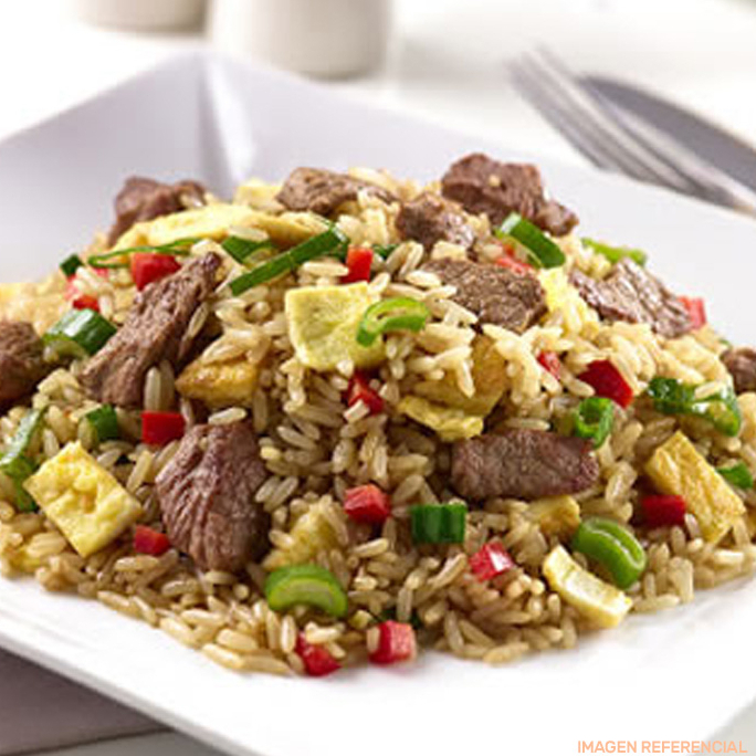 Chifa de carne aderezado con salsa de la casa, cortado y salteado a fuego estilo oriental fusión.