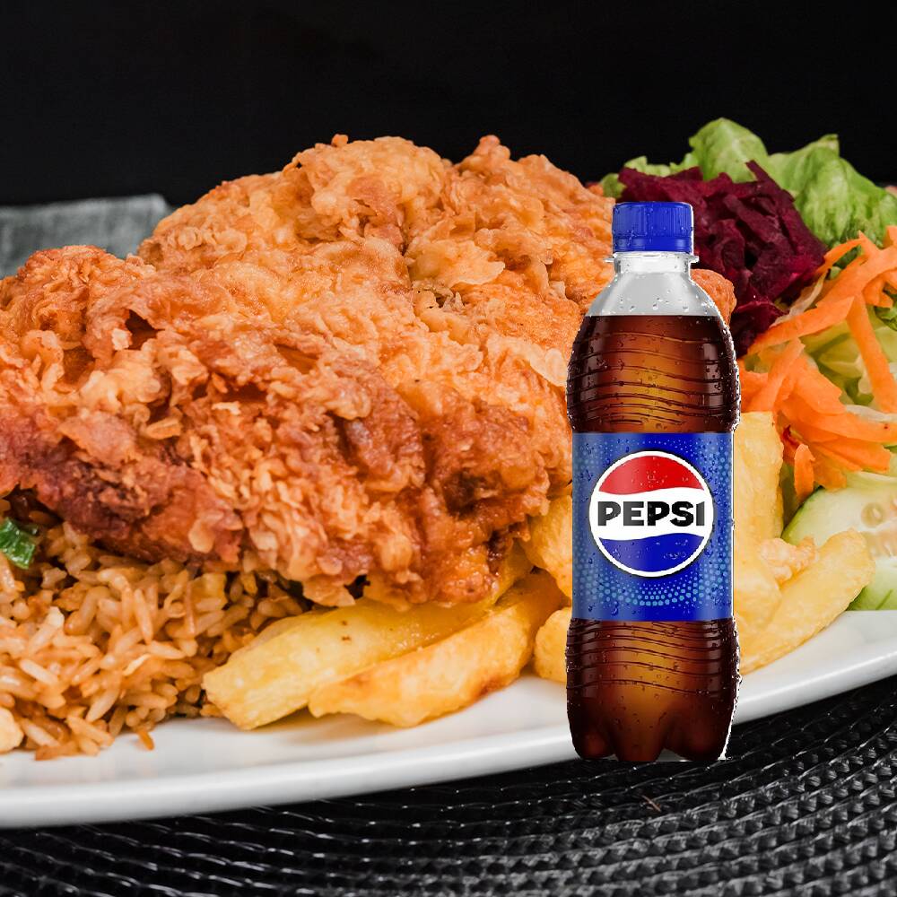 Muslo broaster con chaufa, ensalada y papas, además elige tu bebida adicional a su elección.
