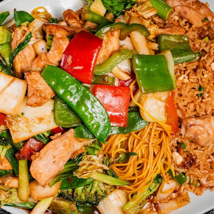 Combinado de pollo aderezado con verdura, frijolito, tallarín cortado y salteado a fuego estilo oriental fusión.