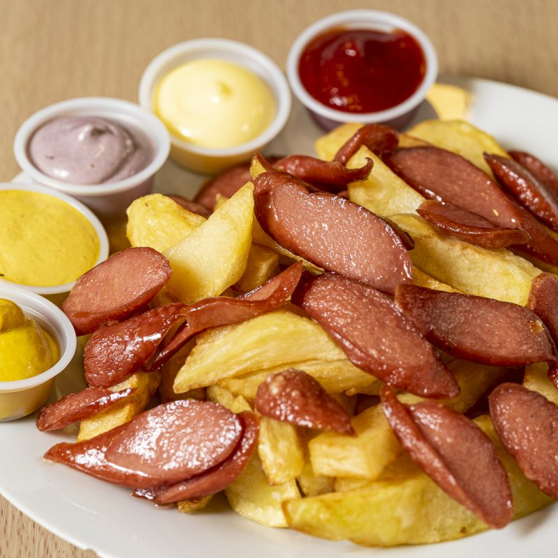Con salchicha de ternera mixta, papas fritas y ensalada de la casa, salsas a elegir.