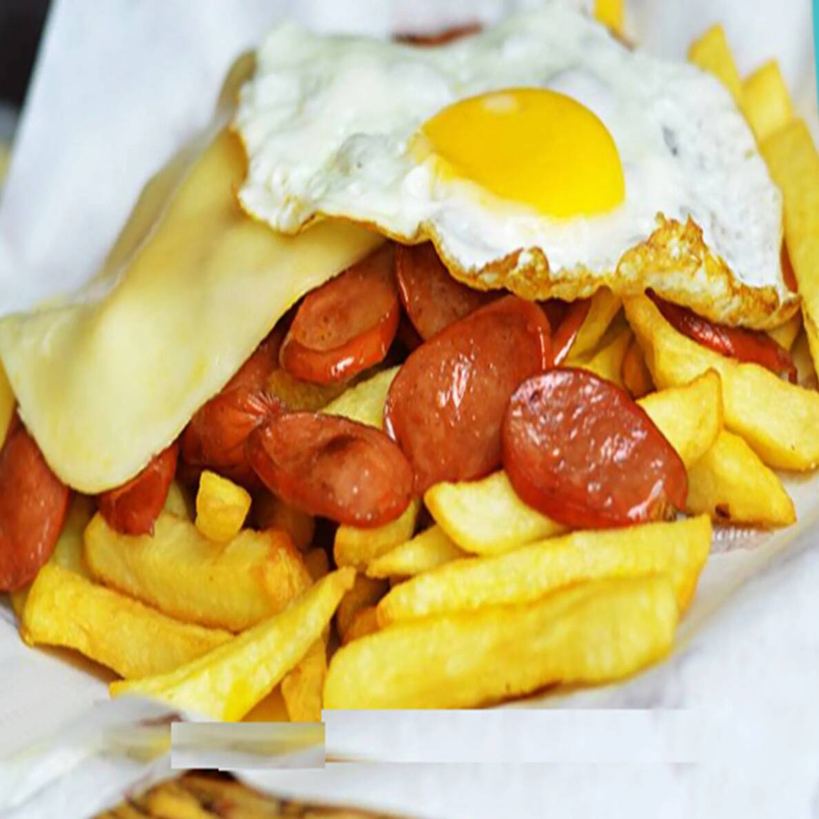 Con salchicha de ternera mixta, huevo frito, chorizo, queso, jamón y papas frita extras.