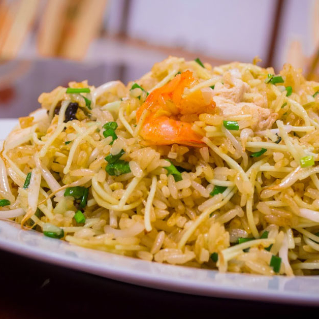 Chifa de pollo y carne aderezado con salsa de la casa, cortado y salteado a fuego estilo oriental fusión.