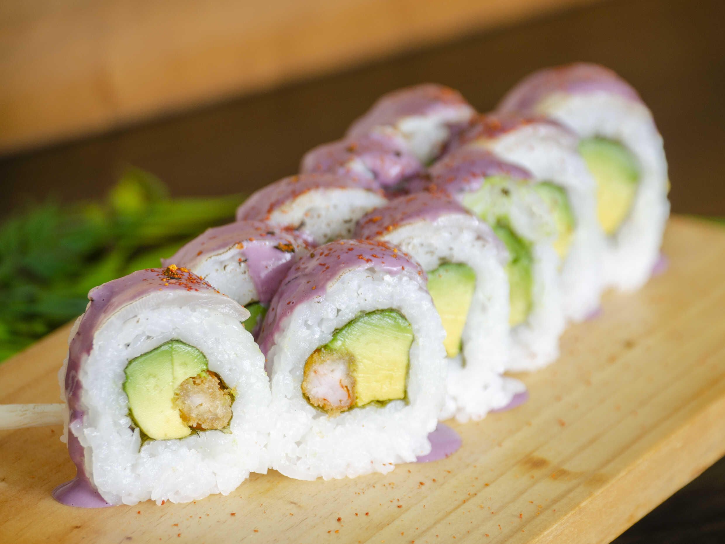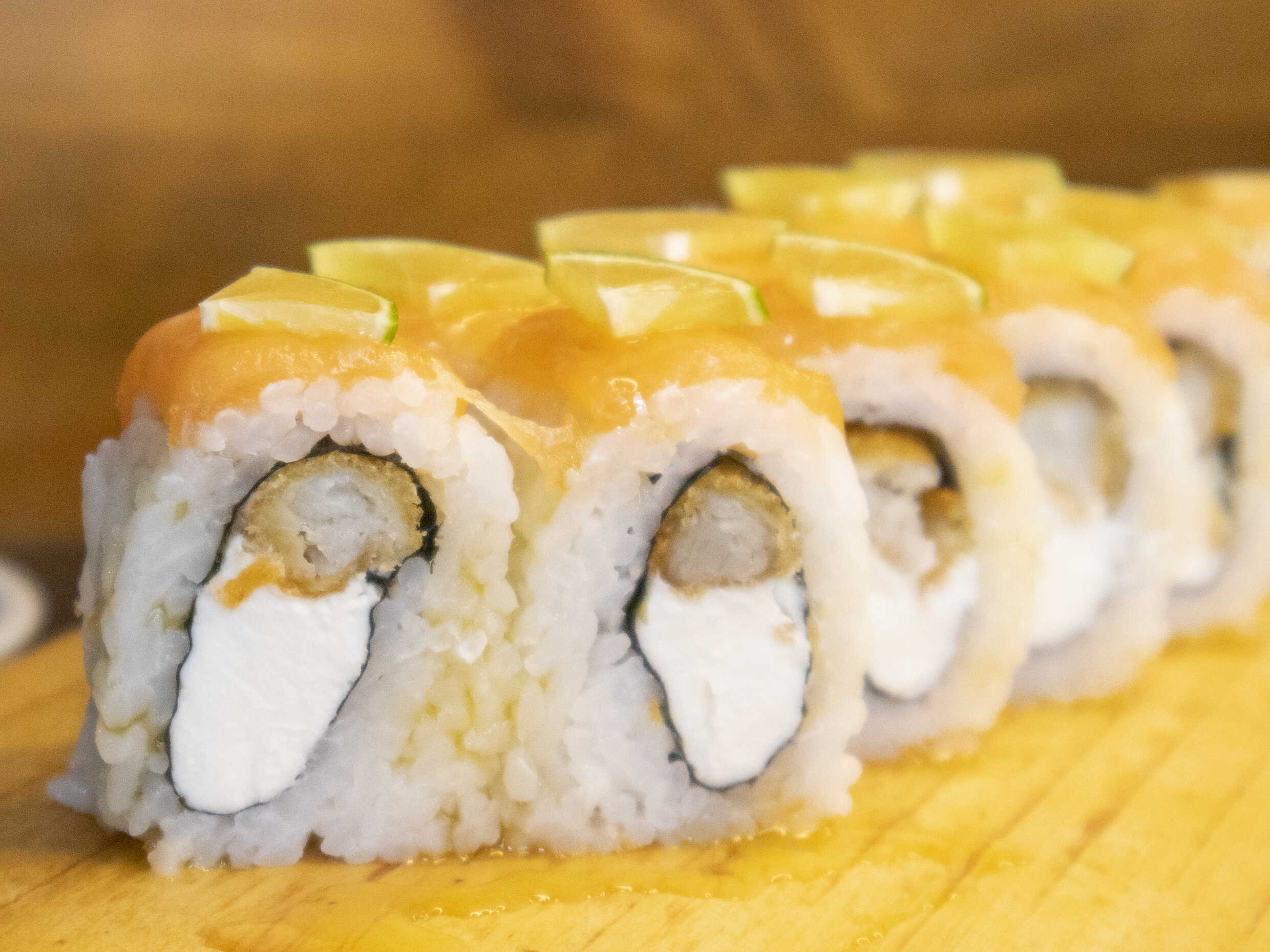 Maki relleno de langostino empanizado, queso crema y cubierto de láminas de salmón en salsa maracuyá.