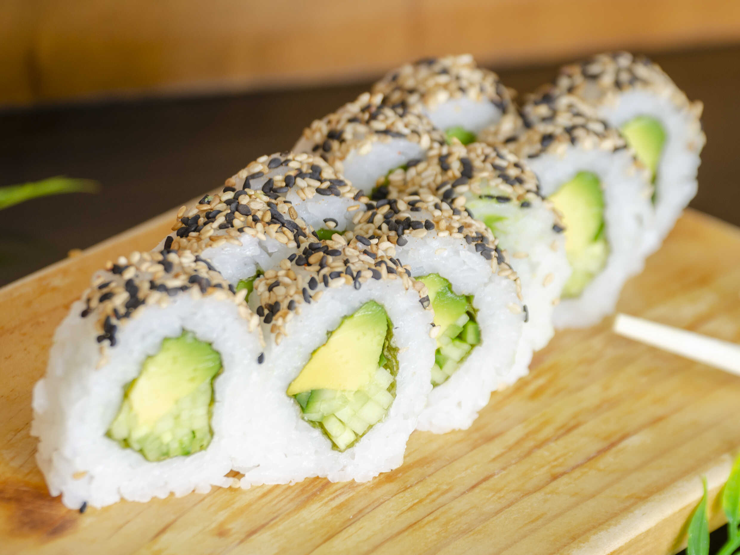 Maki relleno de verduras orientales bañado en semillas de ajonjolí.