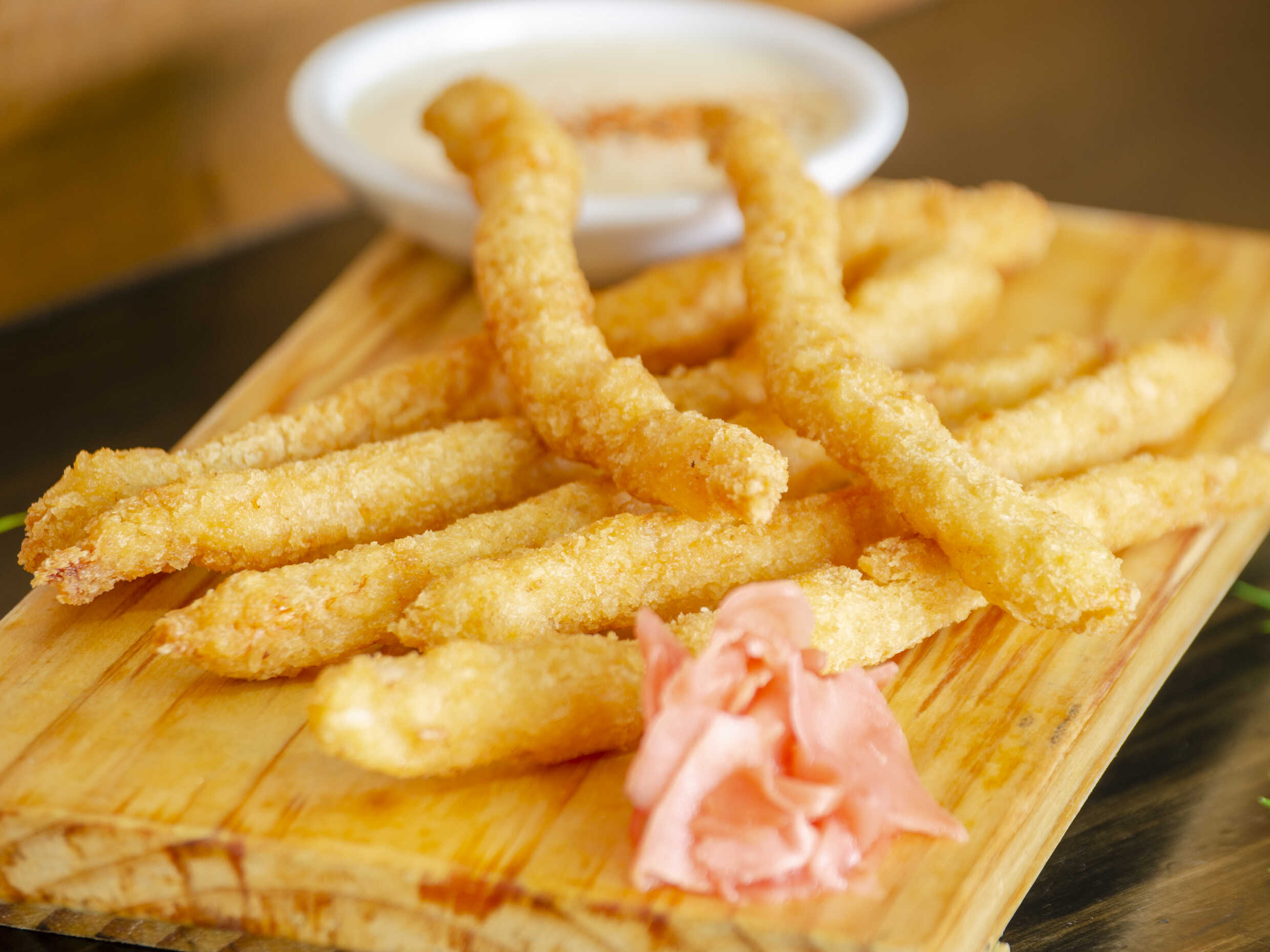 6 unidades de langostino empanizado ocompañado de salsa acevichada