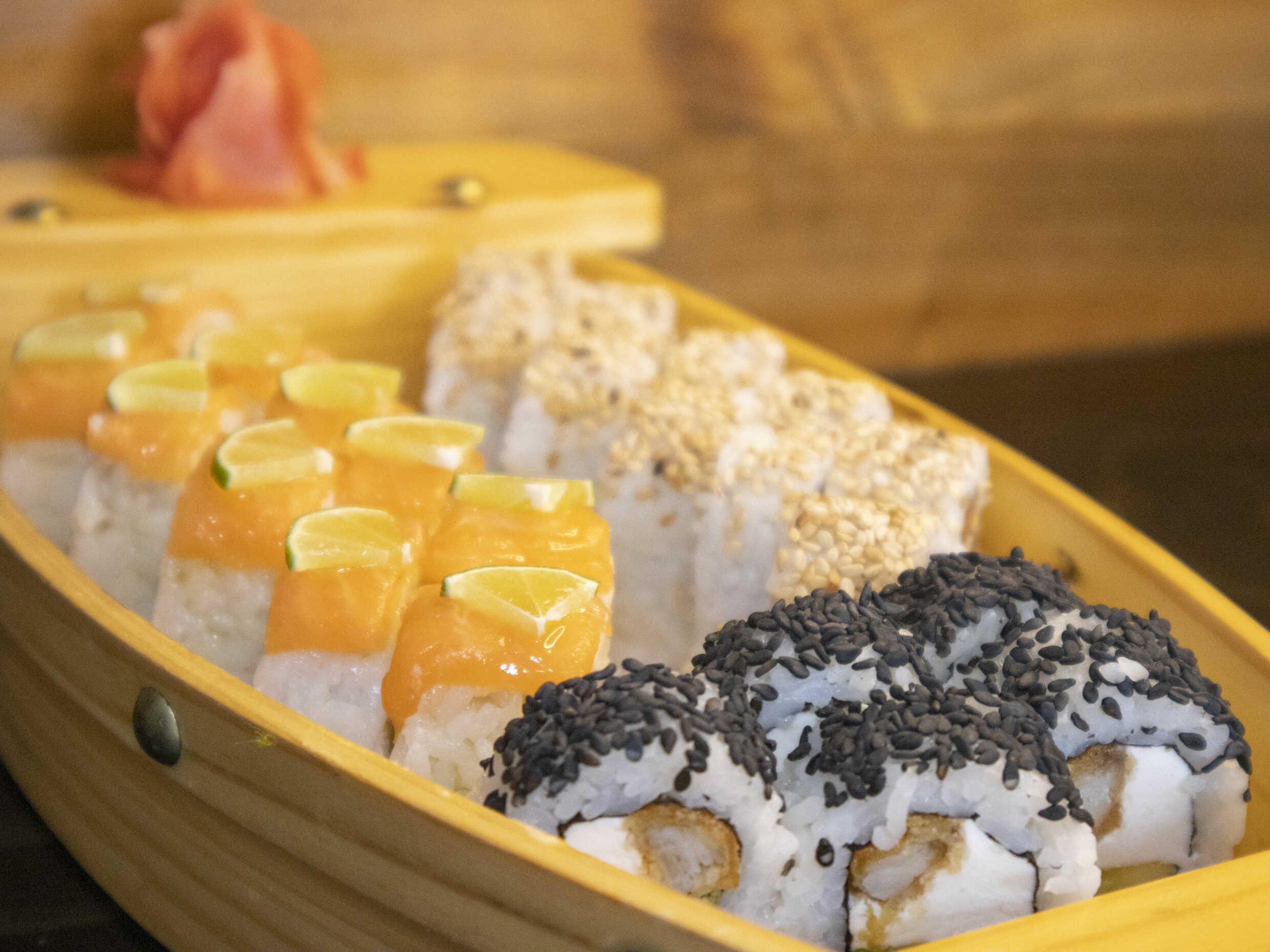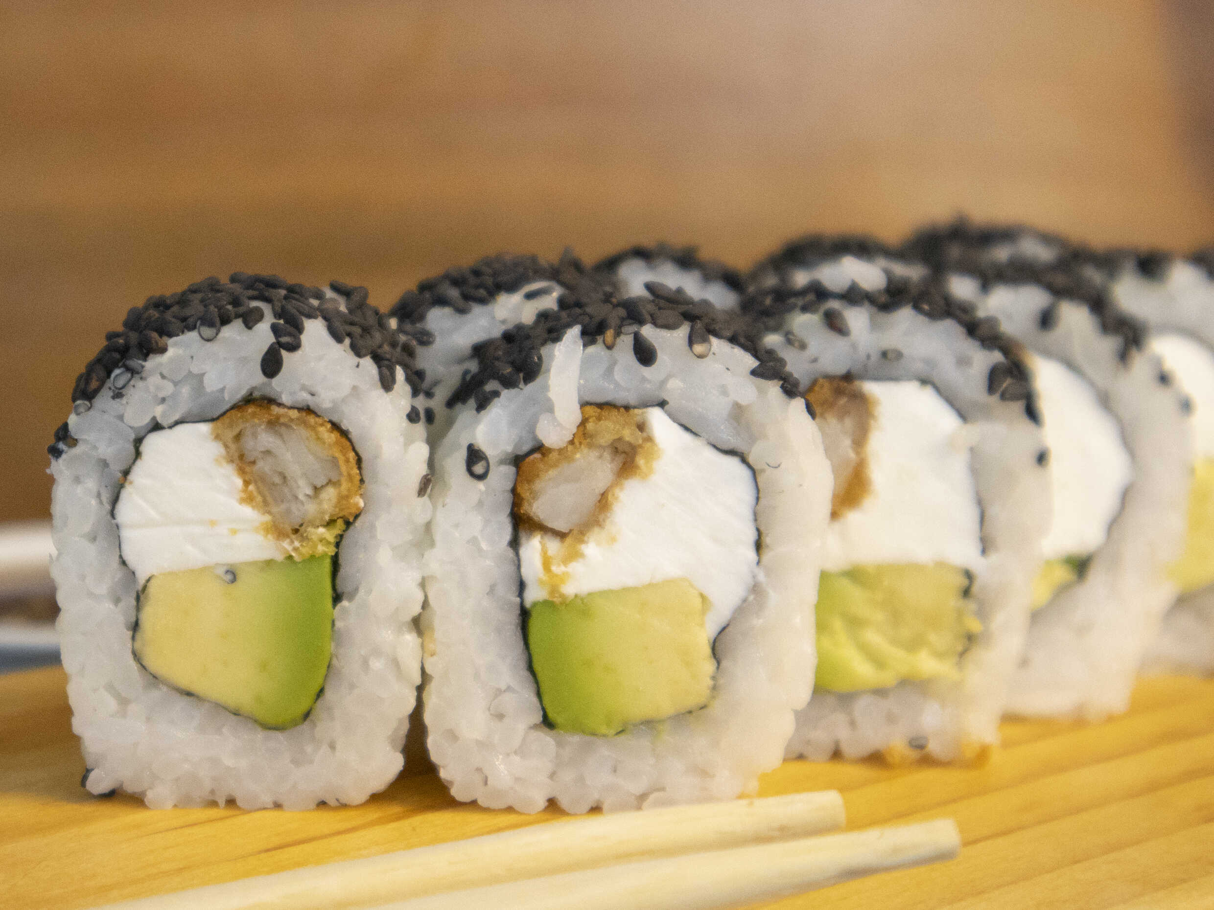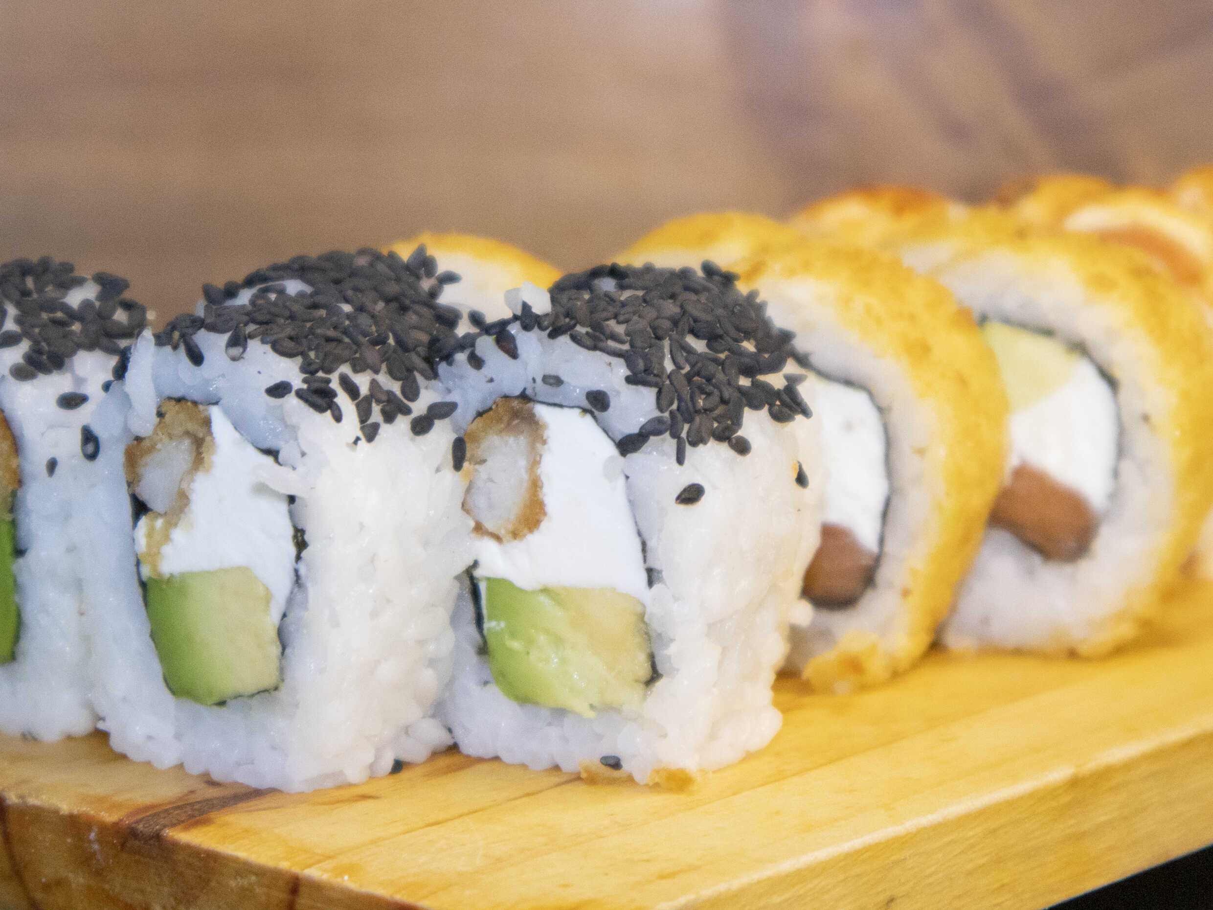 Maki relleno de queso crema, palta, langostino empanizado en semillas de ajonjolí.