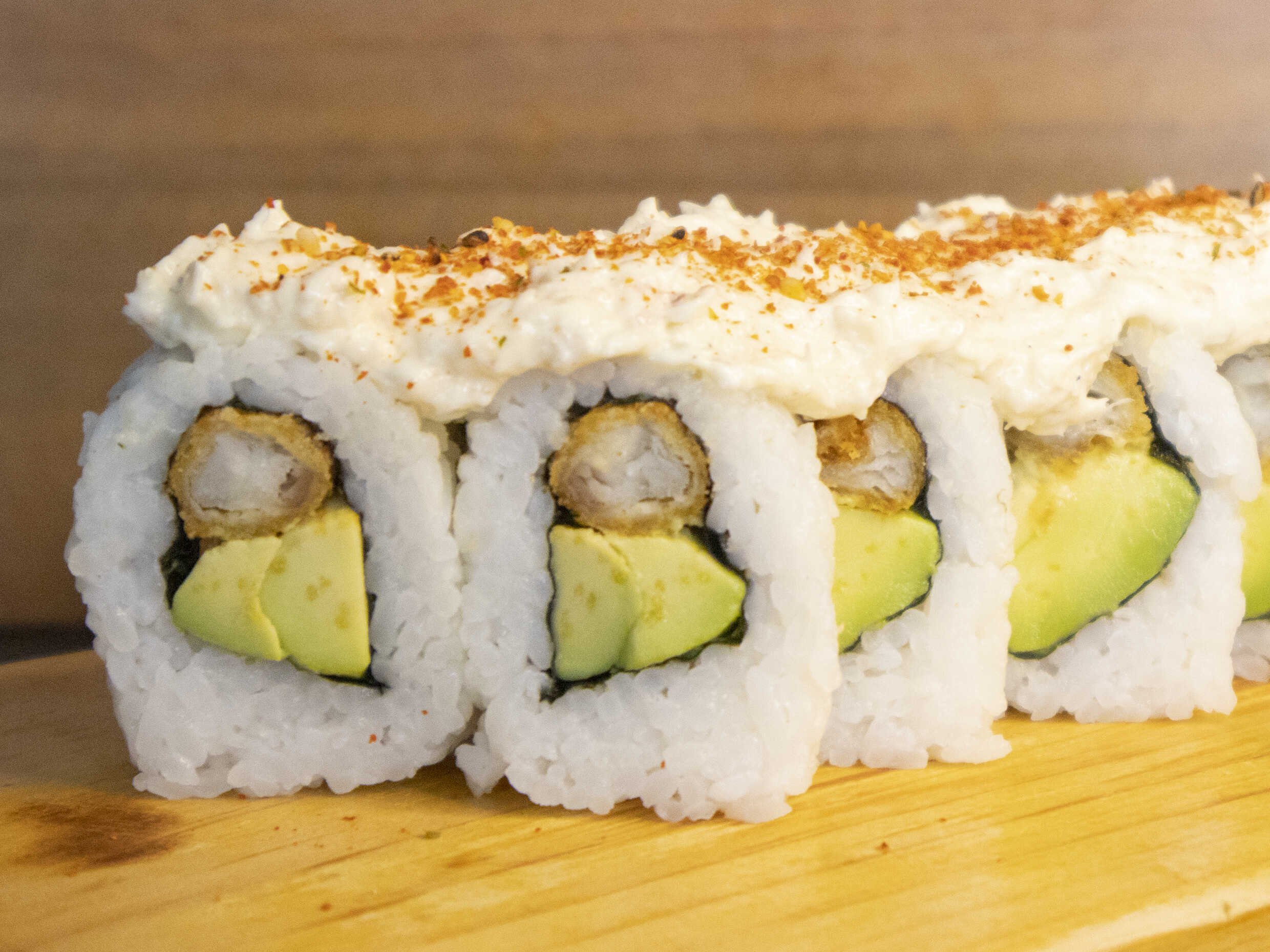Maki relleno de palta, langostino empanizado y pulpa de cangrejo a la mayonesa.
