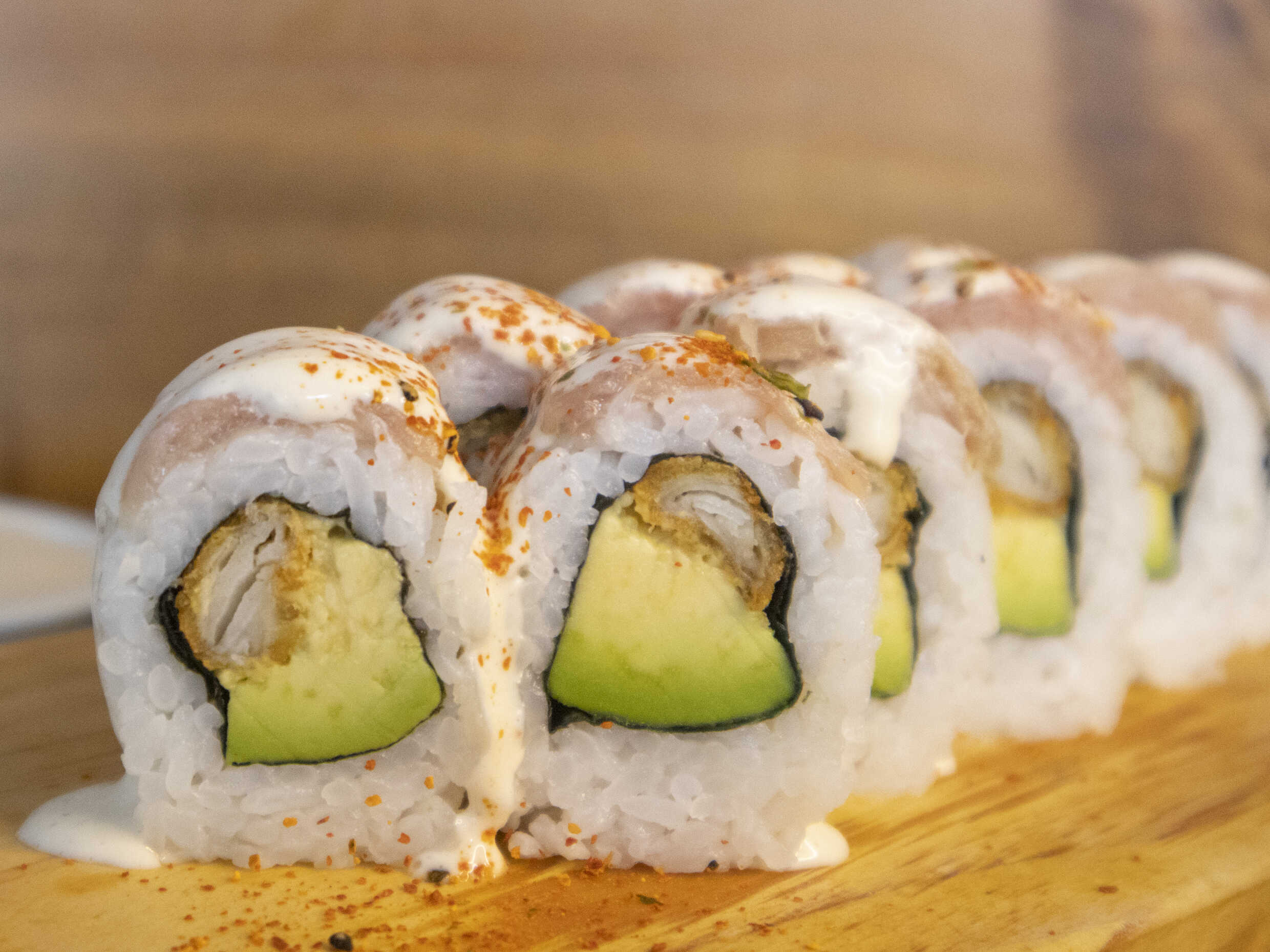 Maki relleno de palta y langostino empanizado, cubierto de láminas de atún.