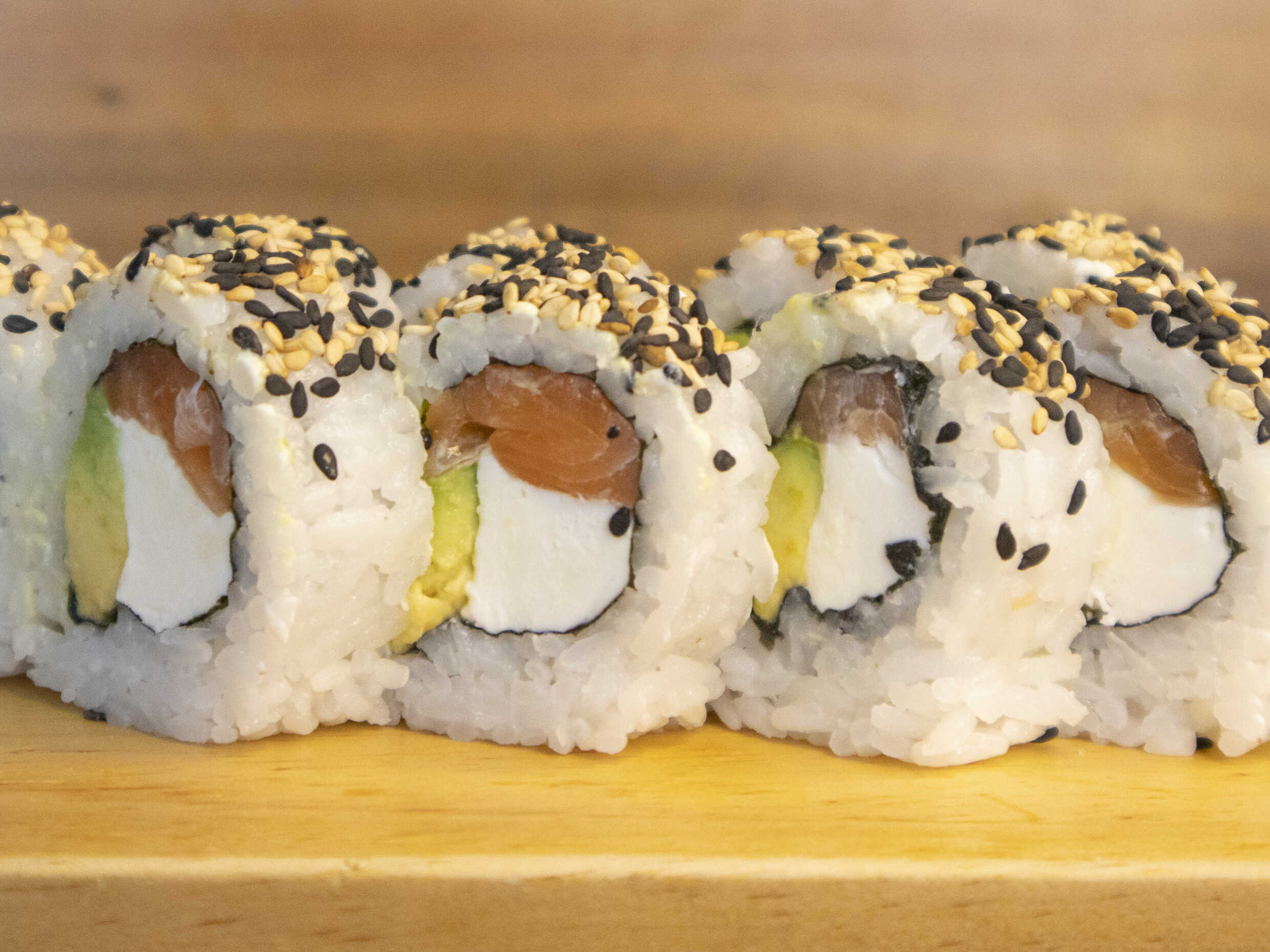 Maki relleno de salmón, palta, queso crema cubierto de semillas de ajonjolí.