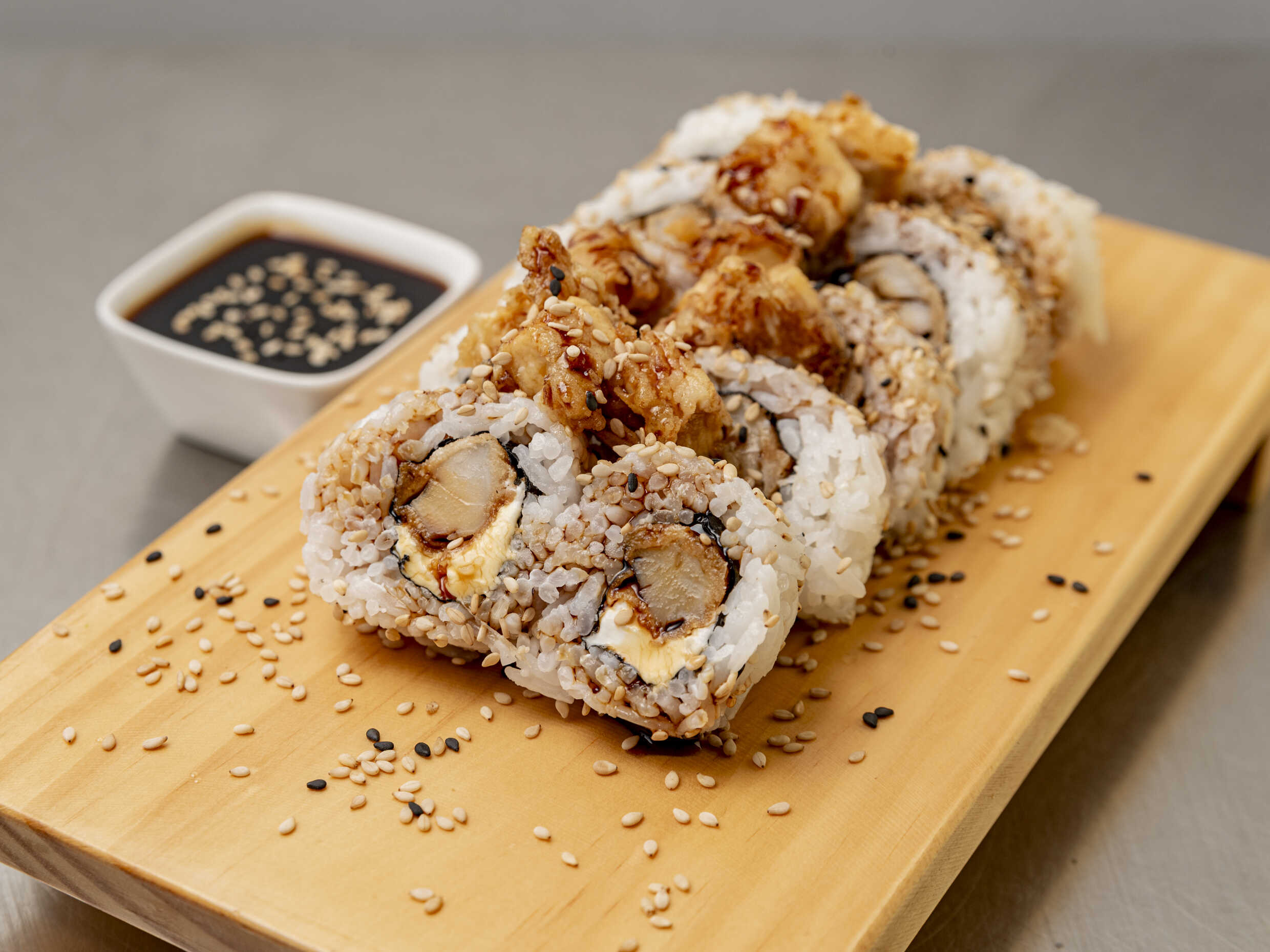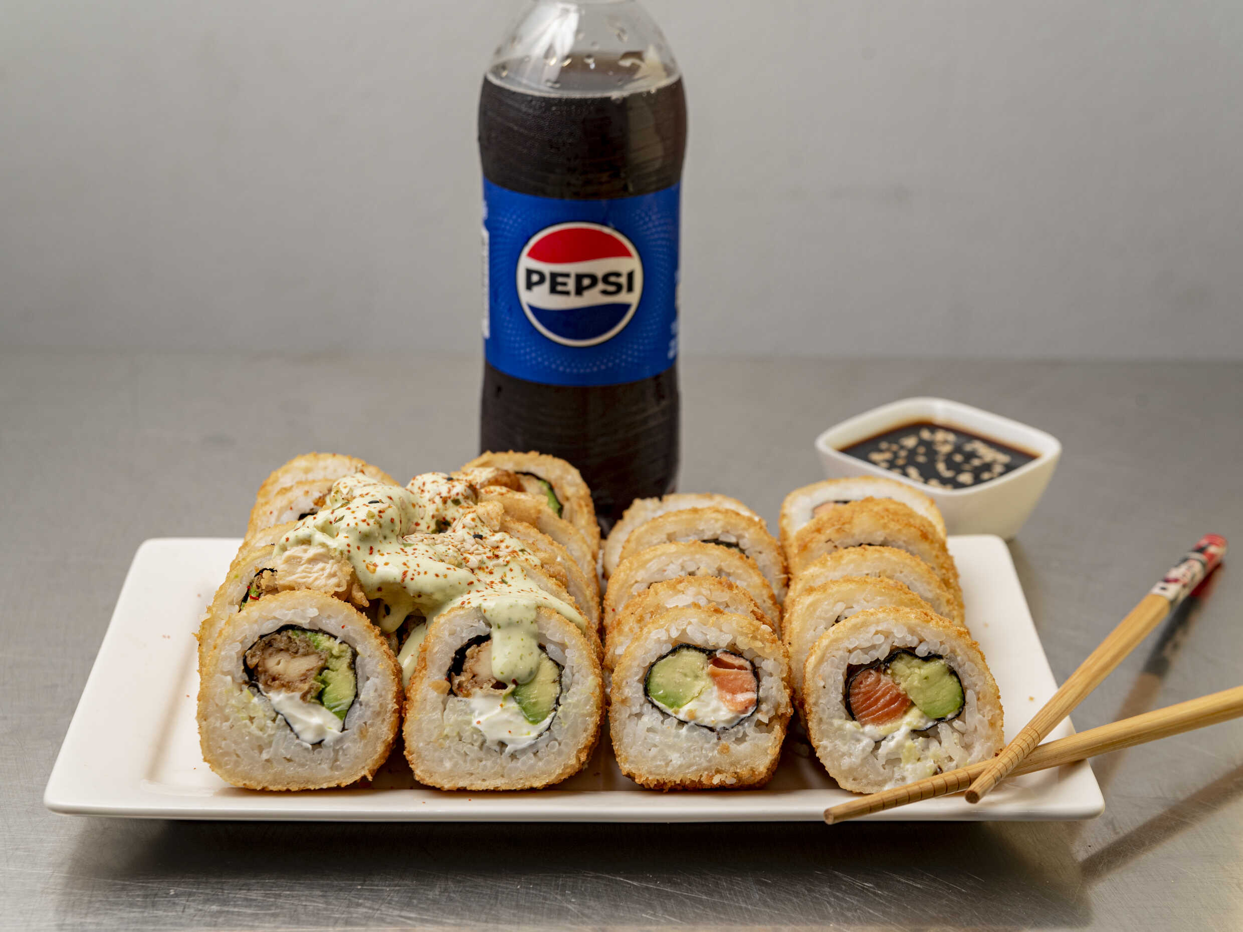 Relleno de salmón, ebi furai, queso philadelphia, finos cortes de palta, 5 roll cubiertos con una textura crujiente, 5 roll clásicos, decorados con queso philadelphia más salsa taré.