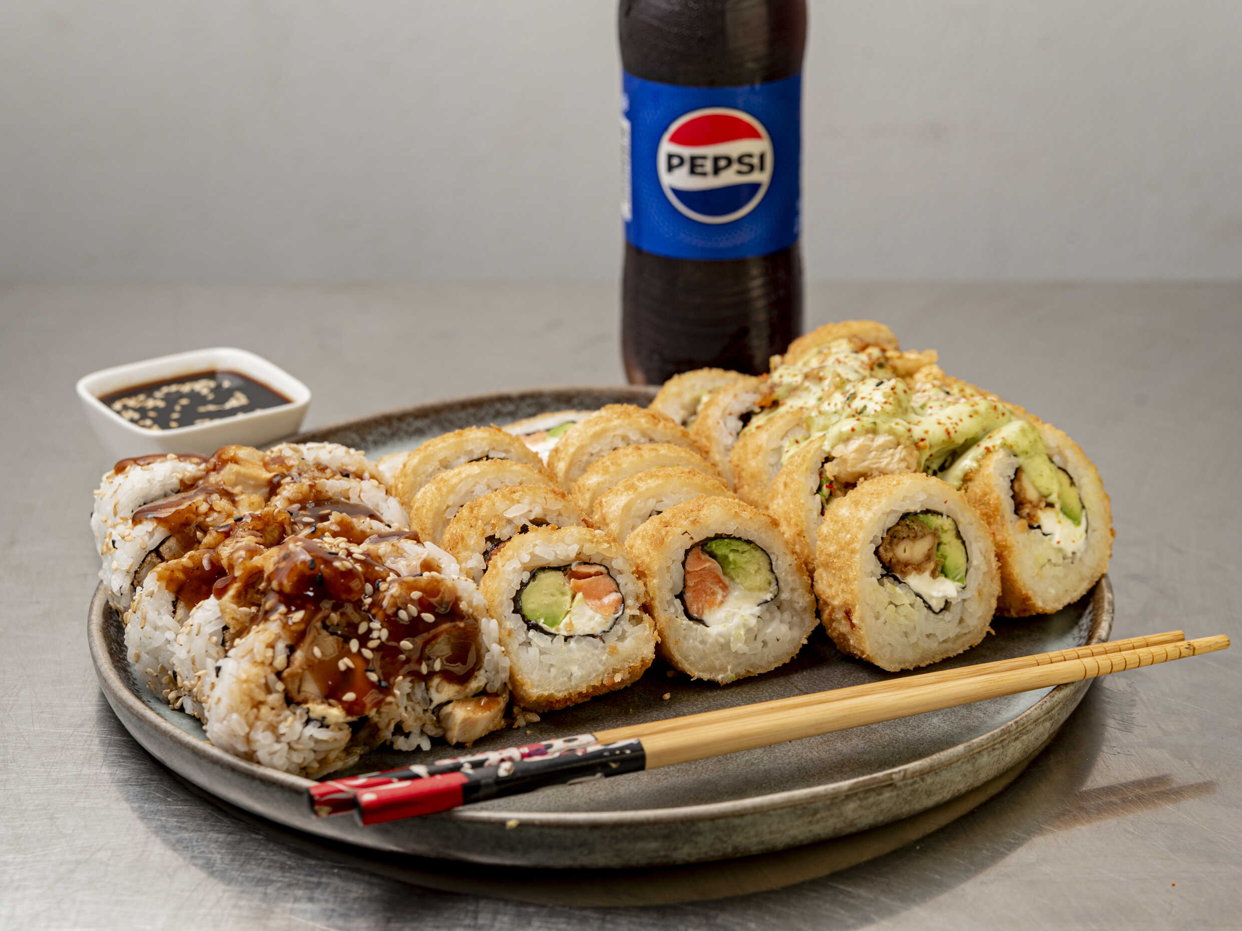 40 cortes de makis 4 sabores a tu elección + 2 salsas de tu elección + 2 palitos y 2 gaseosas de regalo (355ml)