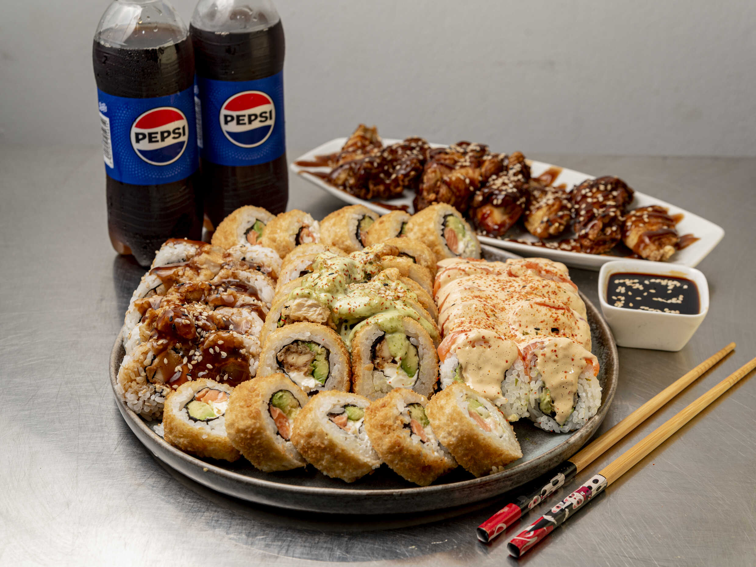 60 cortes de makis 5 sabores a tu elección + 6 alitas en salsa de tu elección + 2 salsas de tu elección + 2 palitos y 2 gaseosas de regalo (355ml)