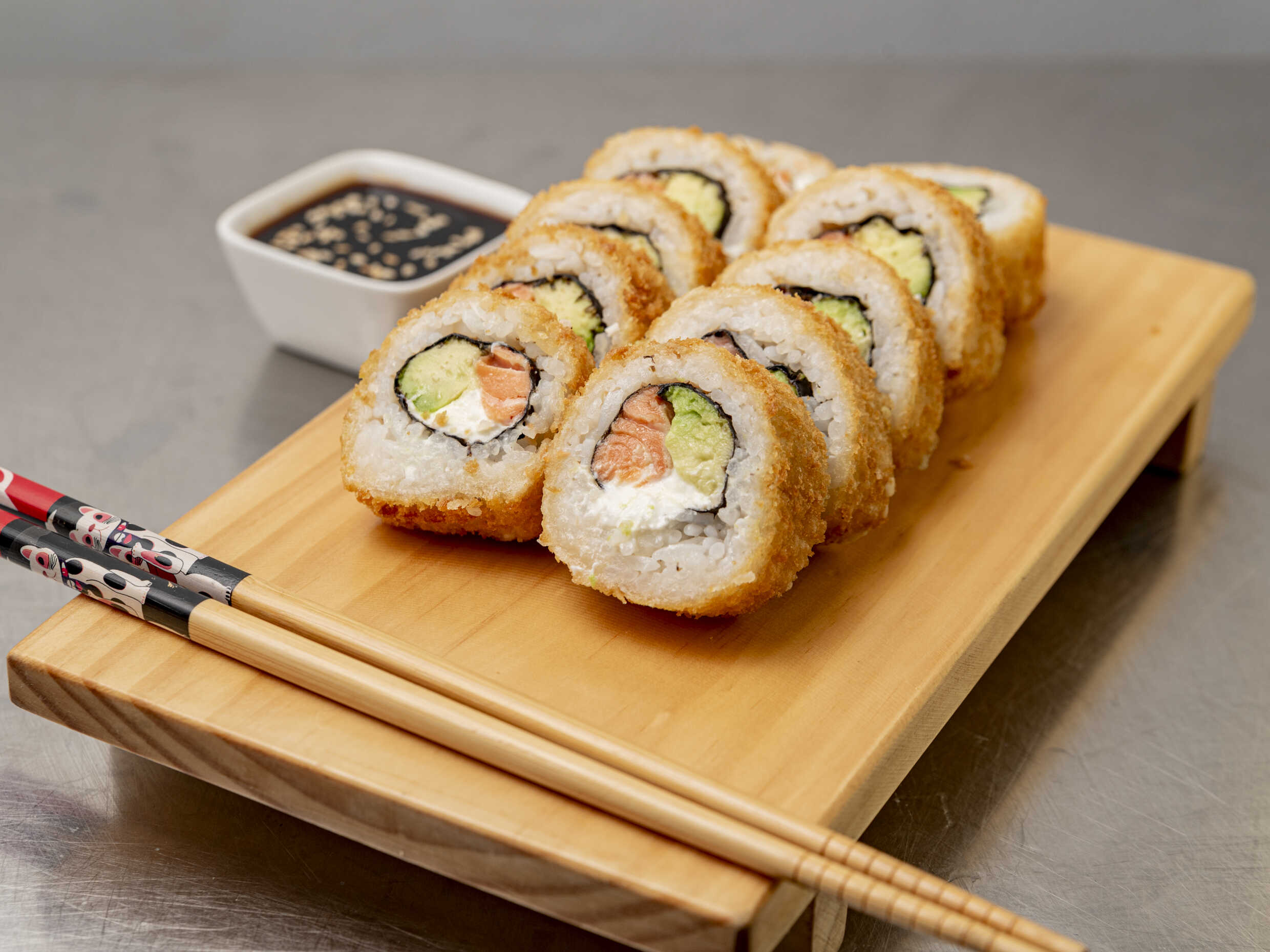 Relleno de salmón, queso philadelphia y finos cortes de palta cubiertos con una textura crujiente entre tempura con panko.