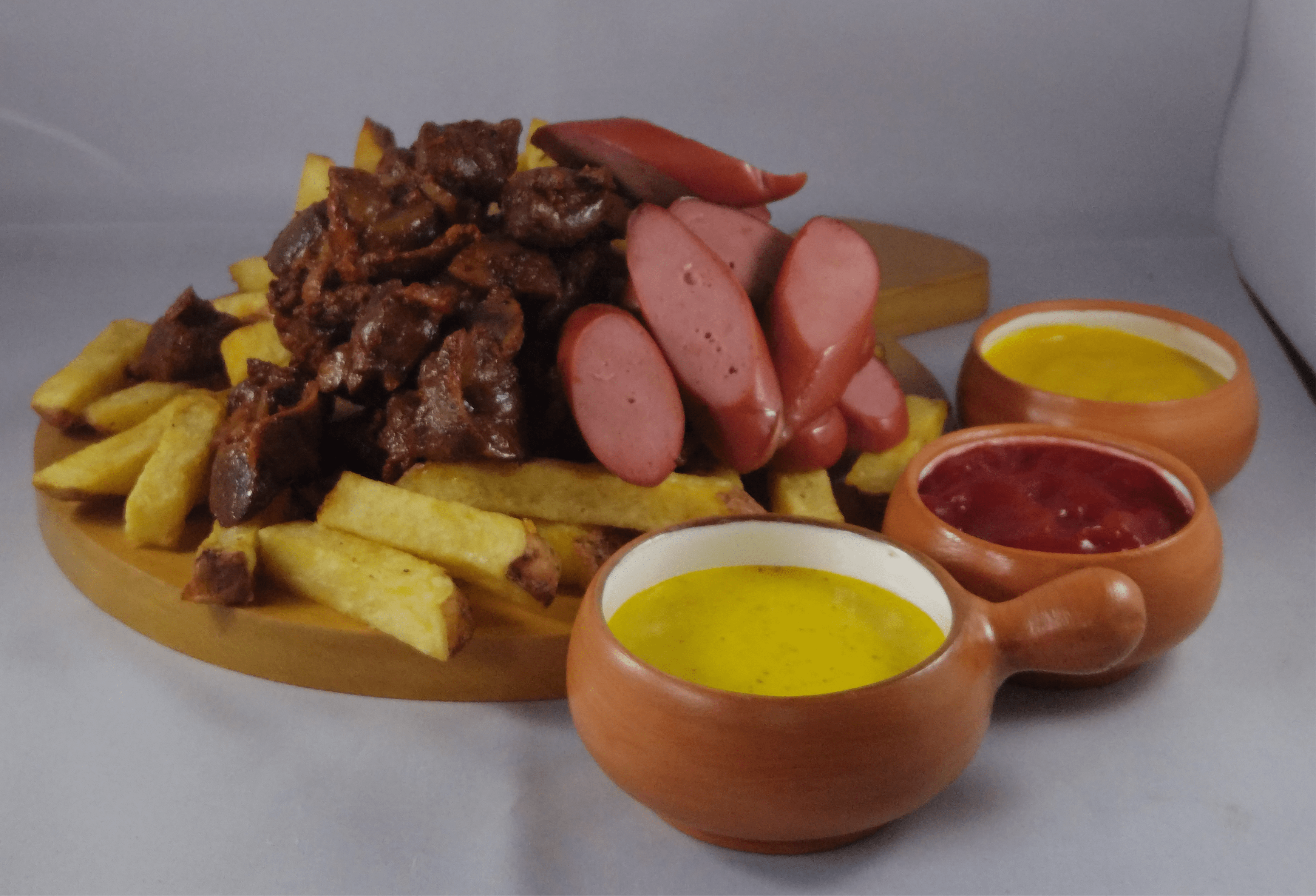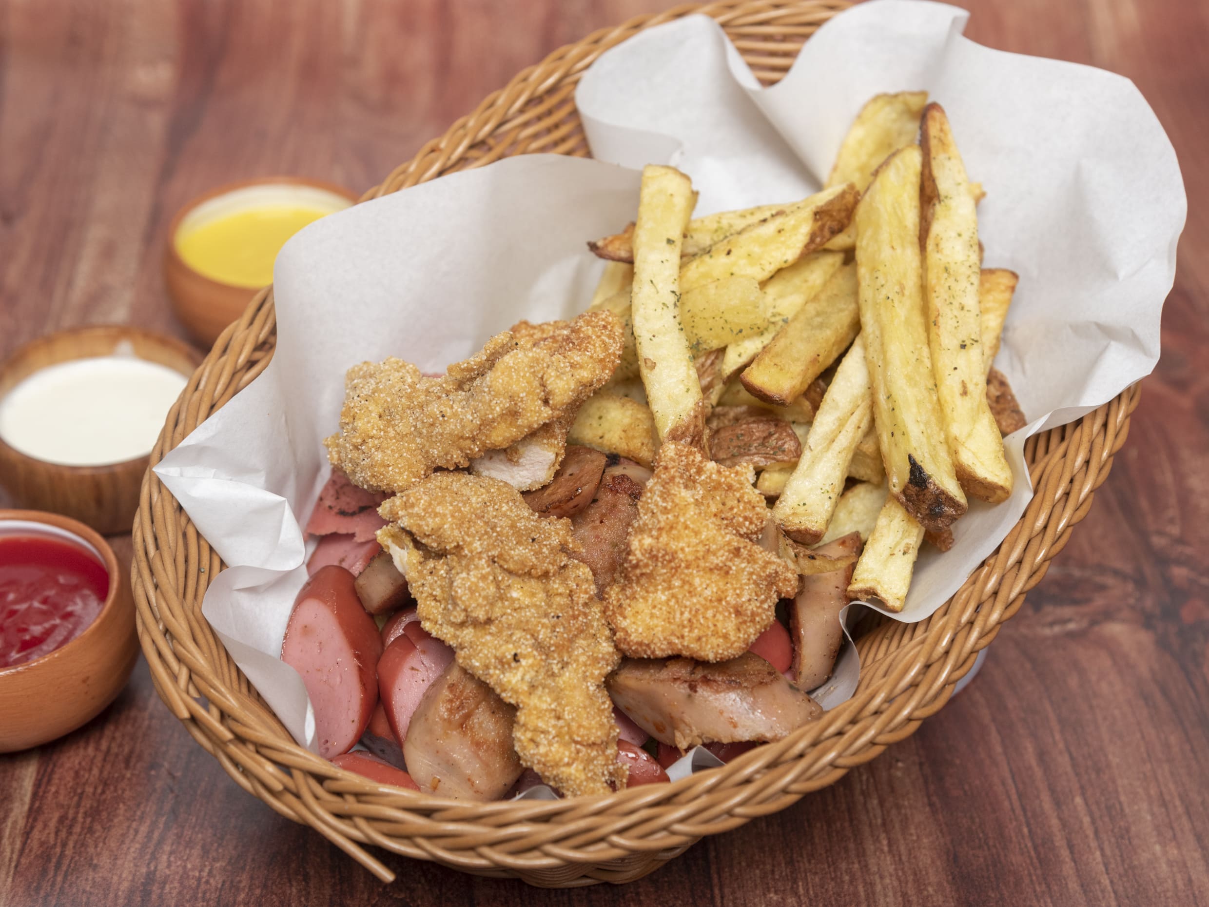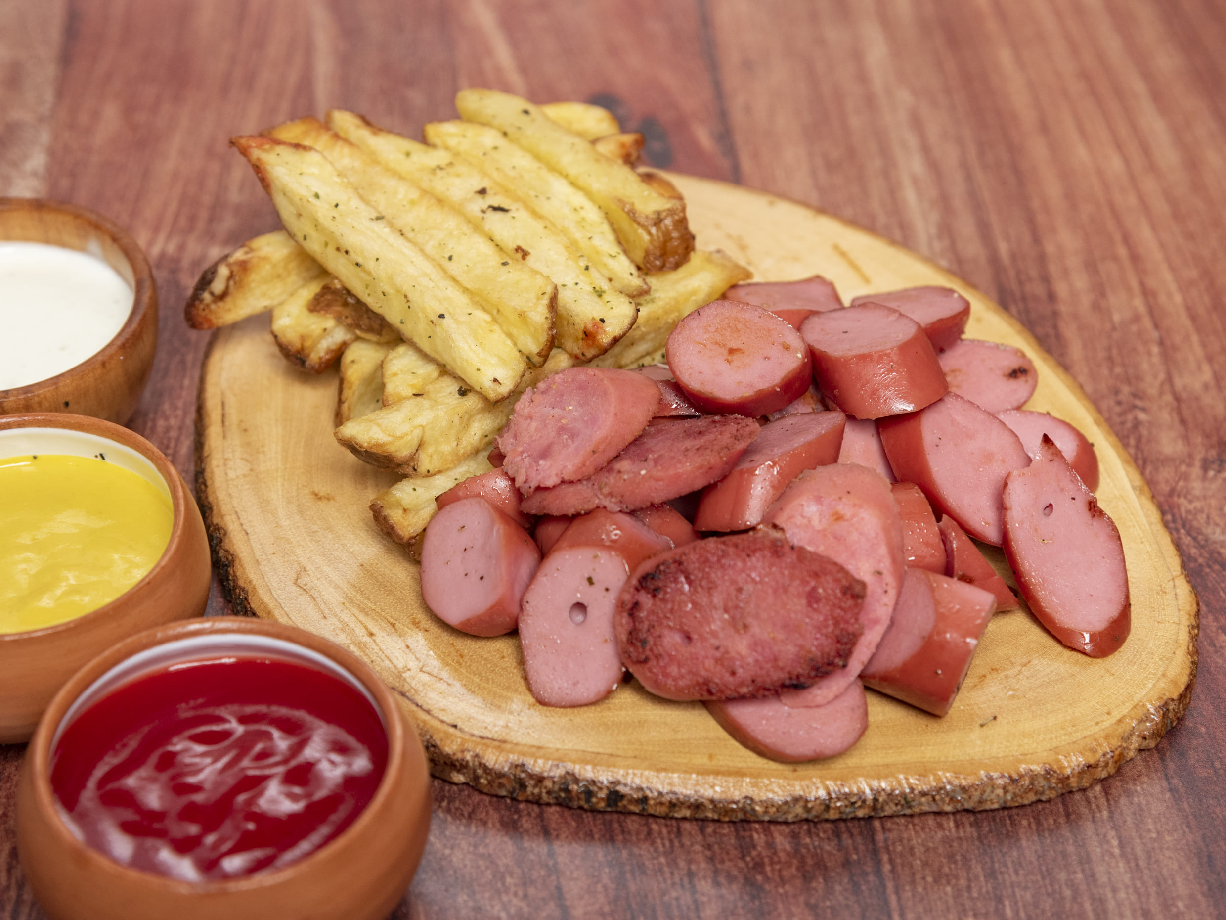 Salchicha frankfurter, chorizo criollo y deditos de pechuga.