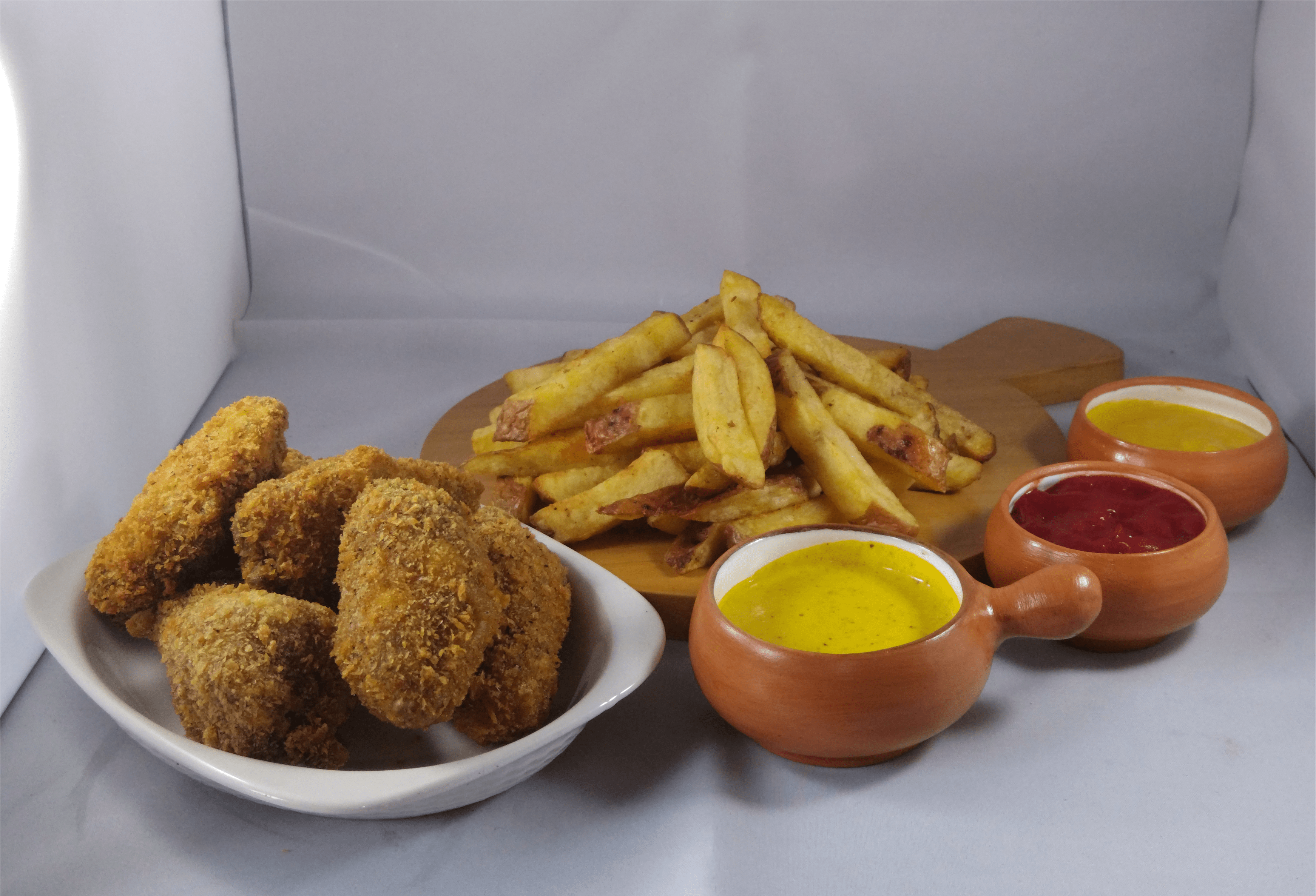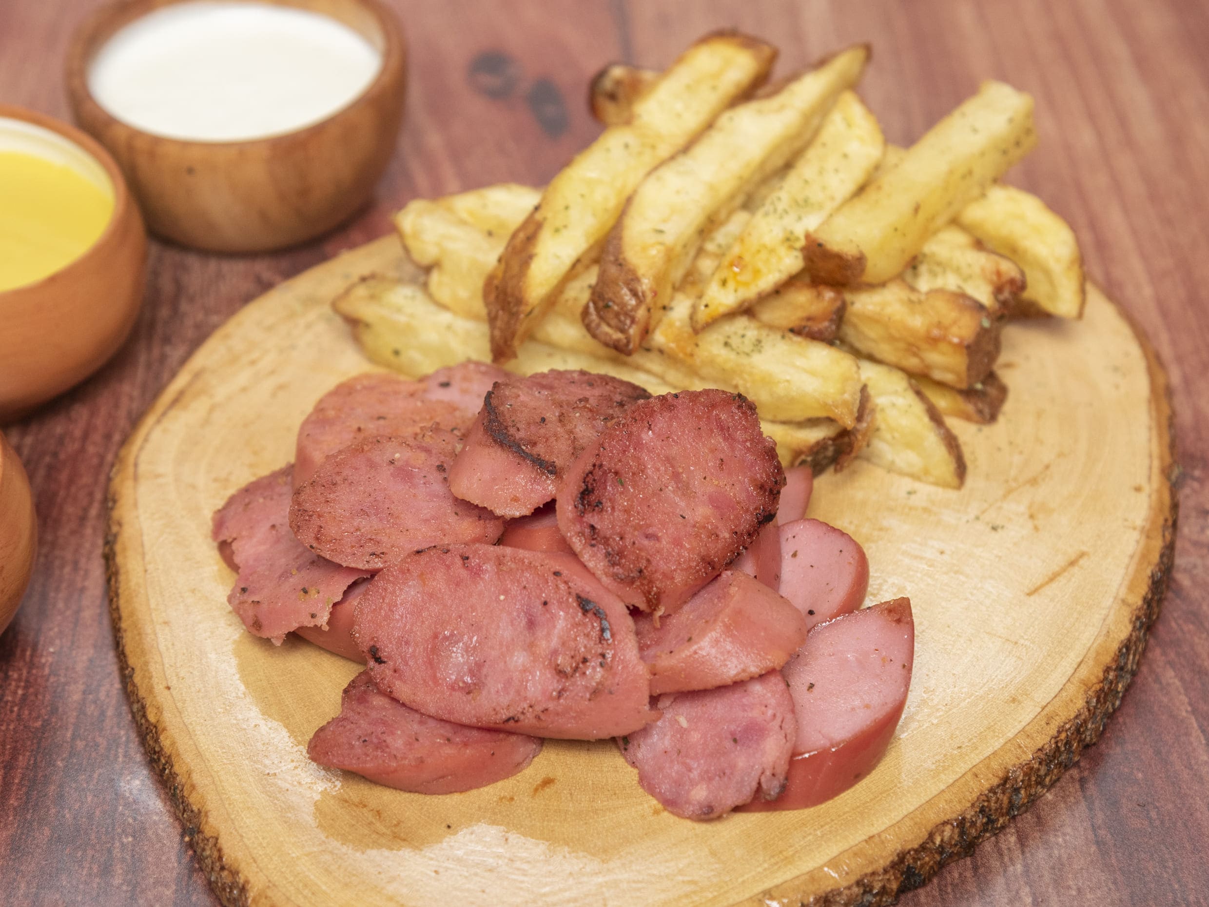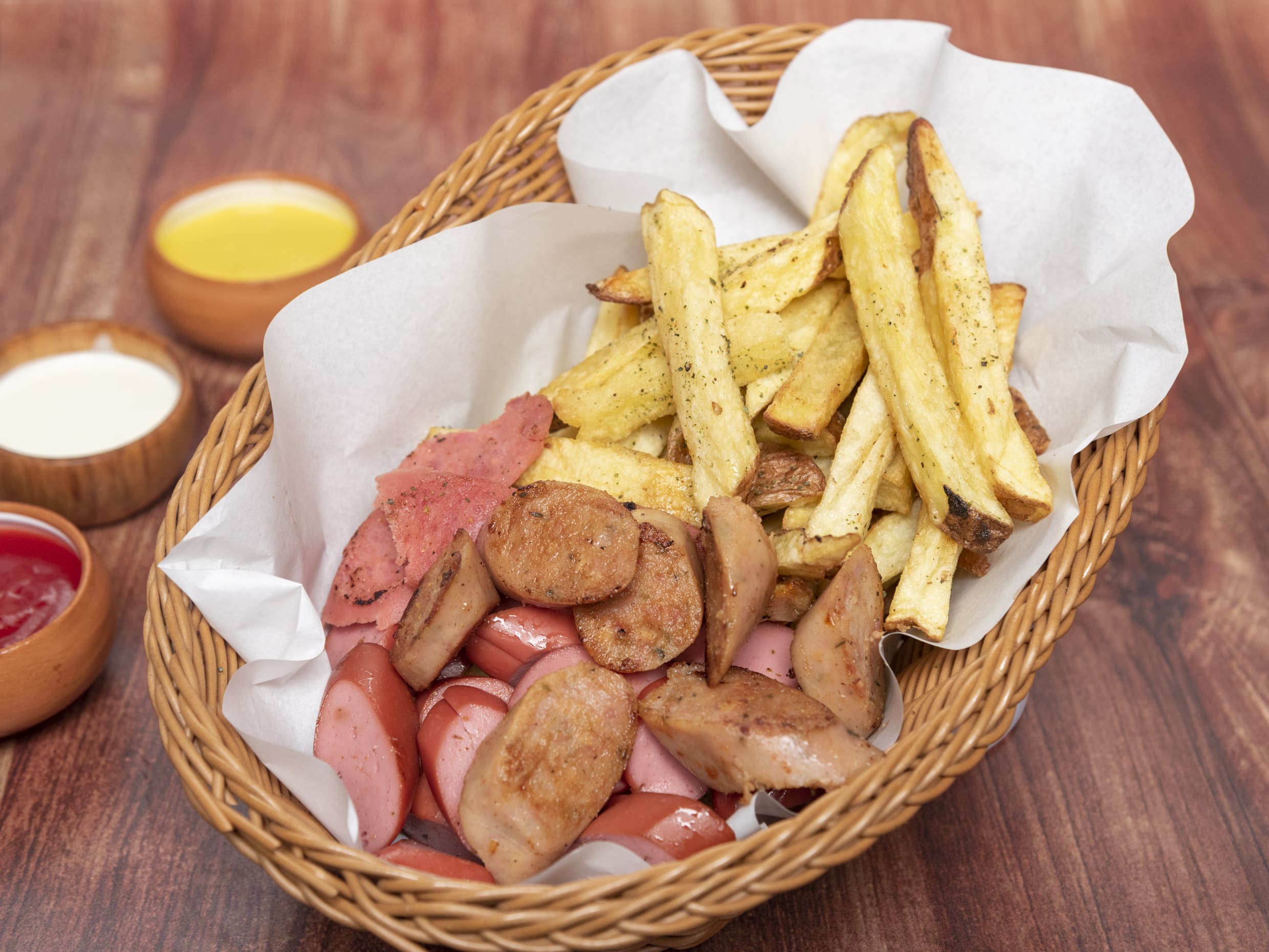 Salchicha frankfurter, chorizo criollo y deditos de pechuga.
