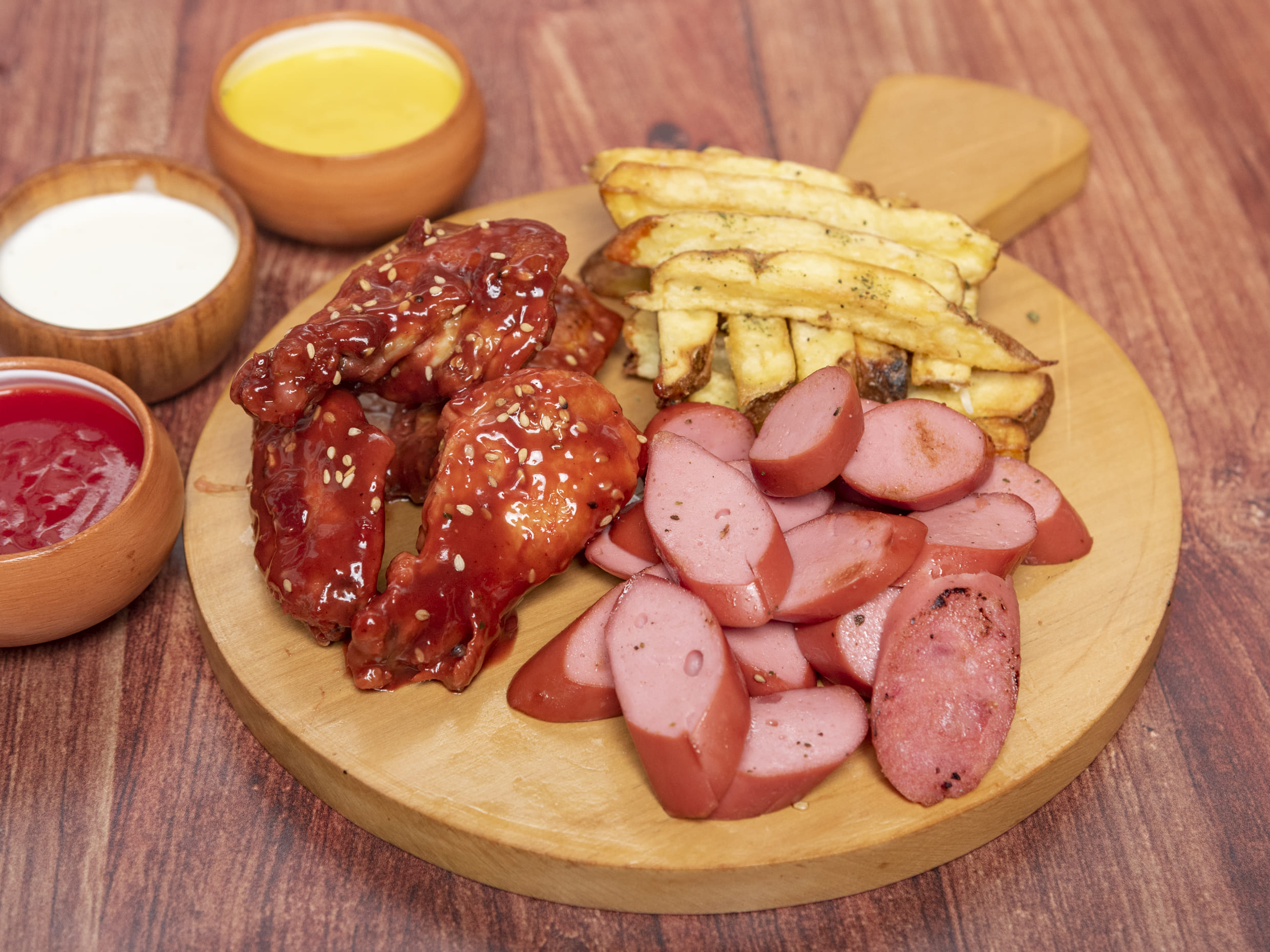 Salchicha frankfurter, 3 alitas fritas bañadas en nuestra salsa BBQ.