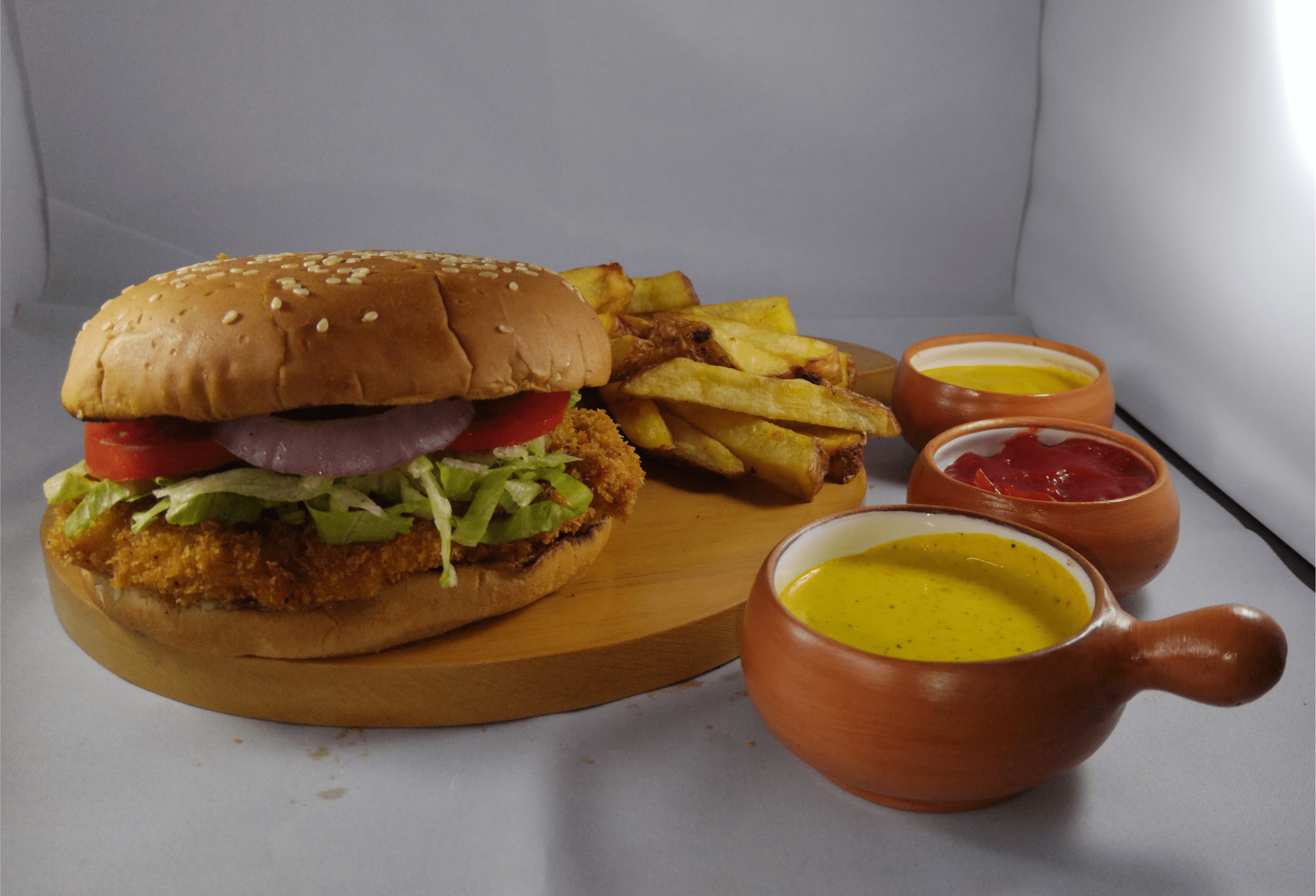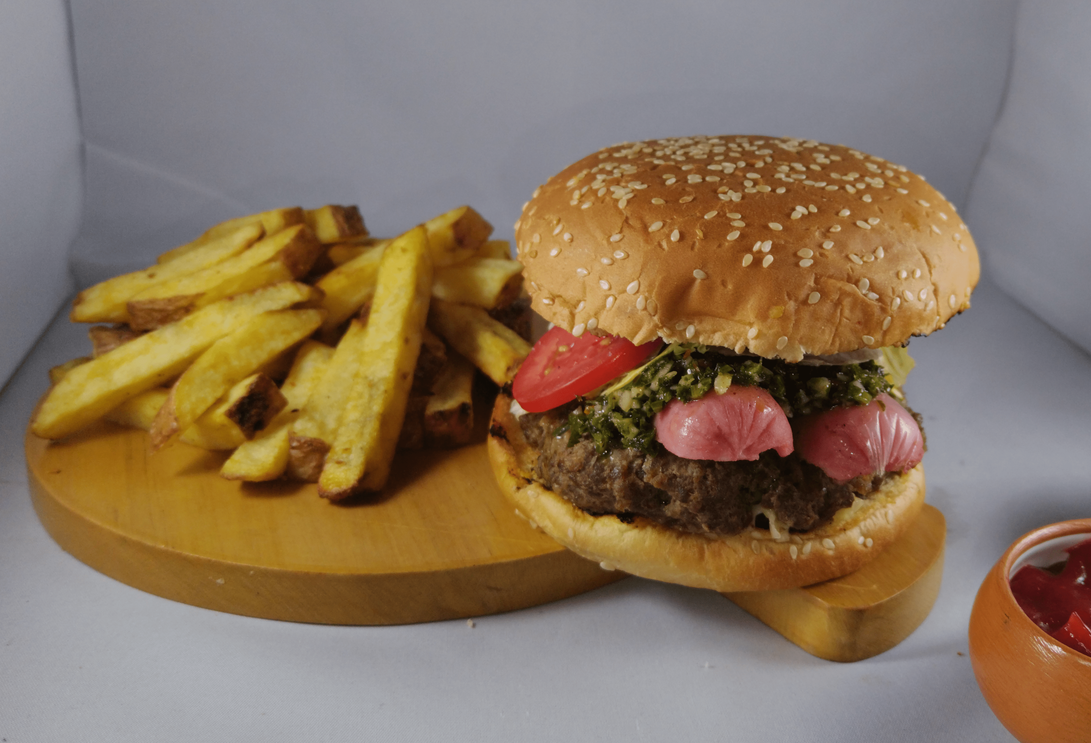 Hamburguesa, chorizo criollo, chimichurri casero y vegetales frescos.