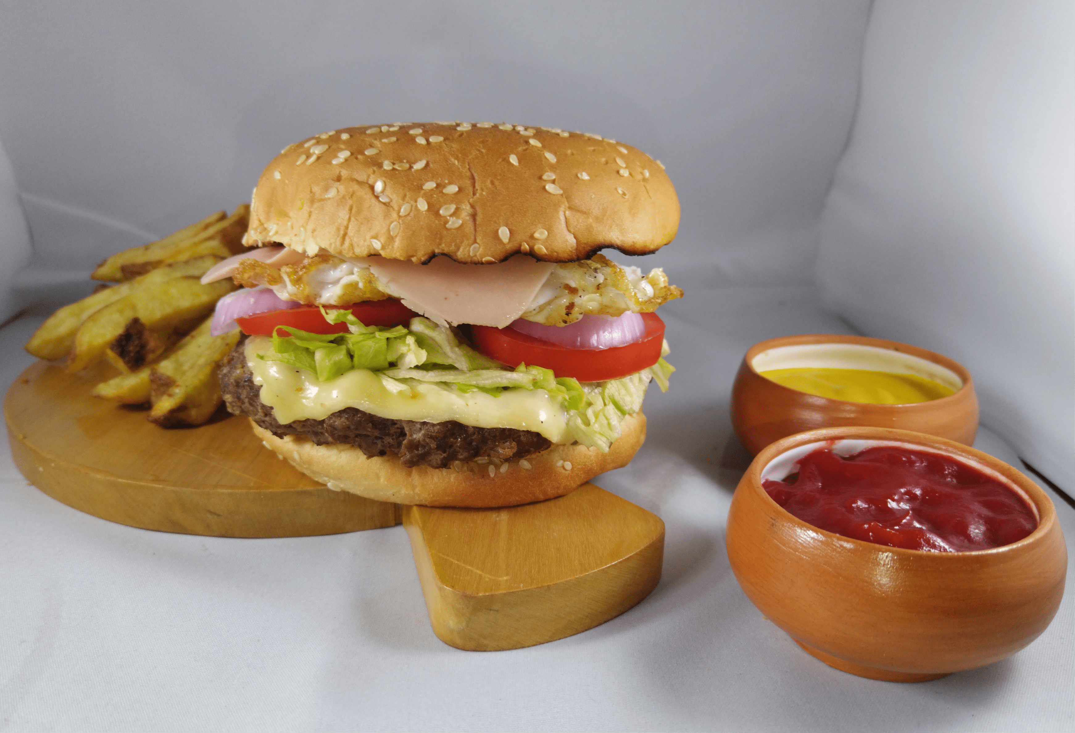 Hamburguesa, huevo, jamón, queso, vegetales frescos y crujientes.