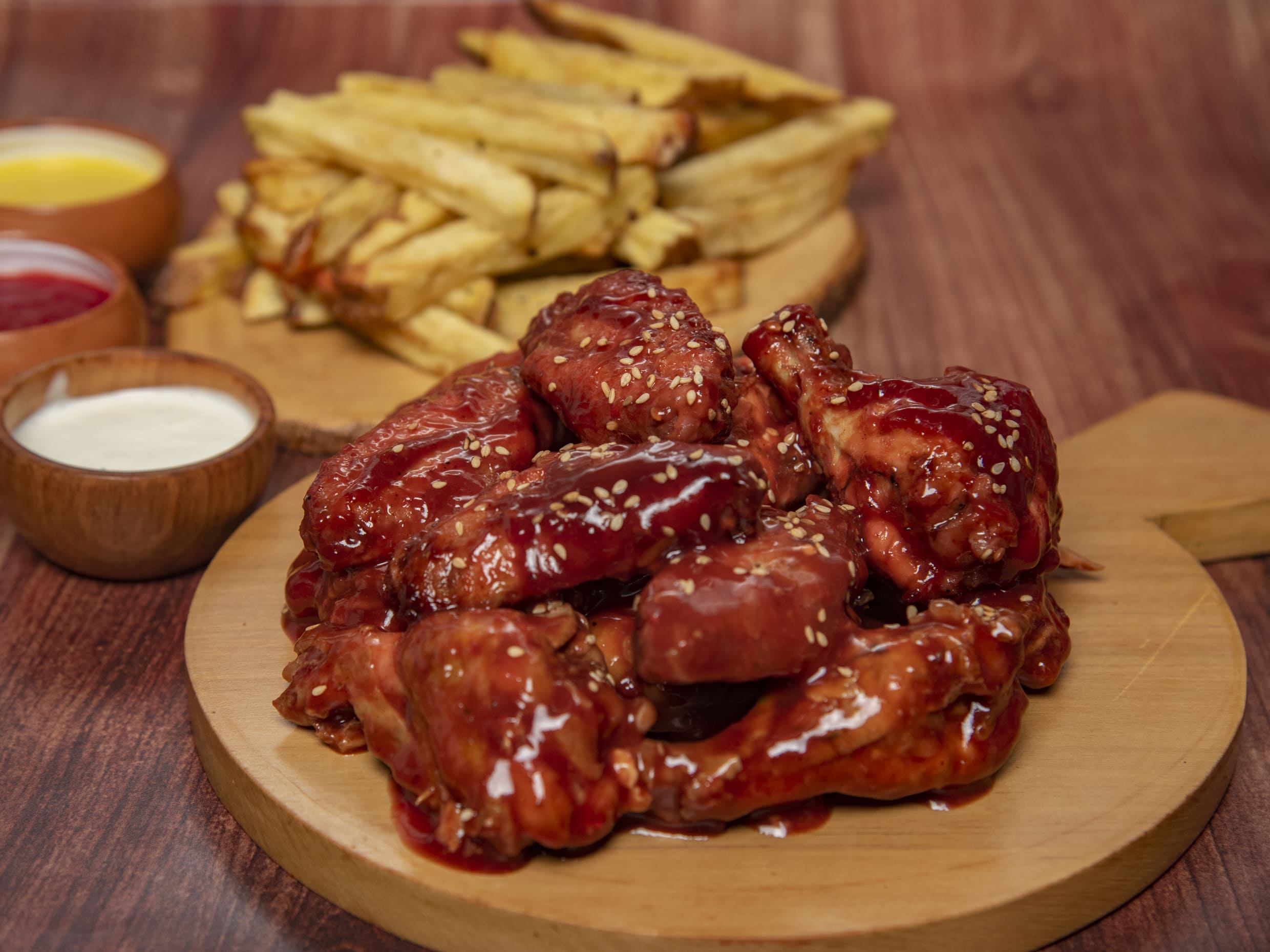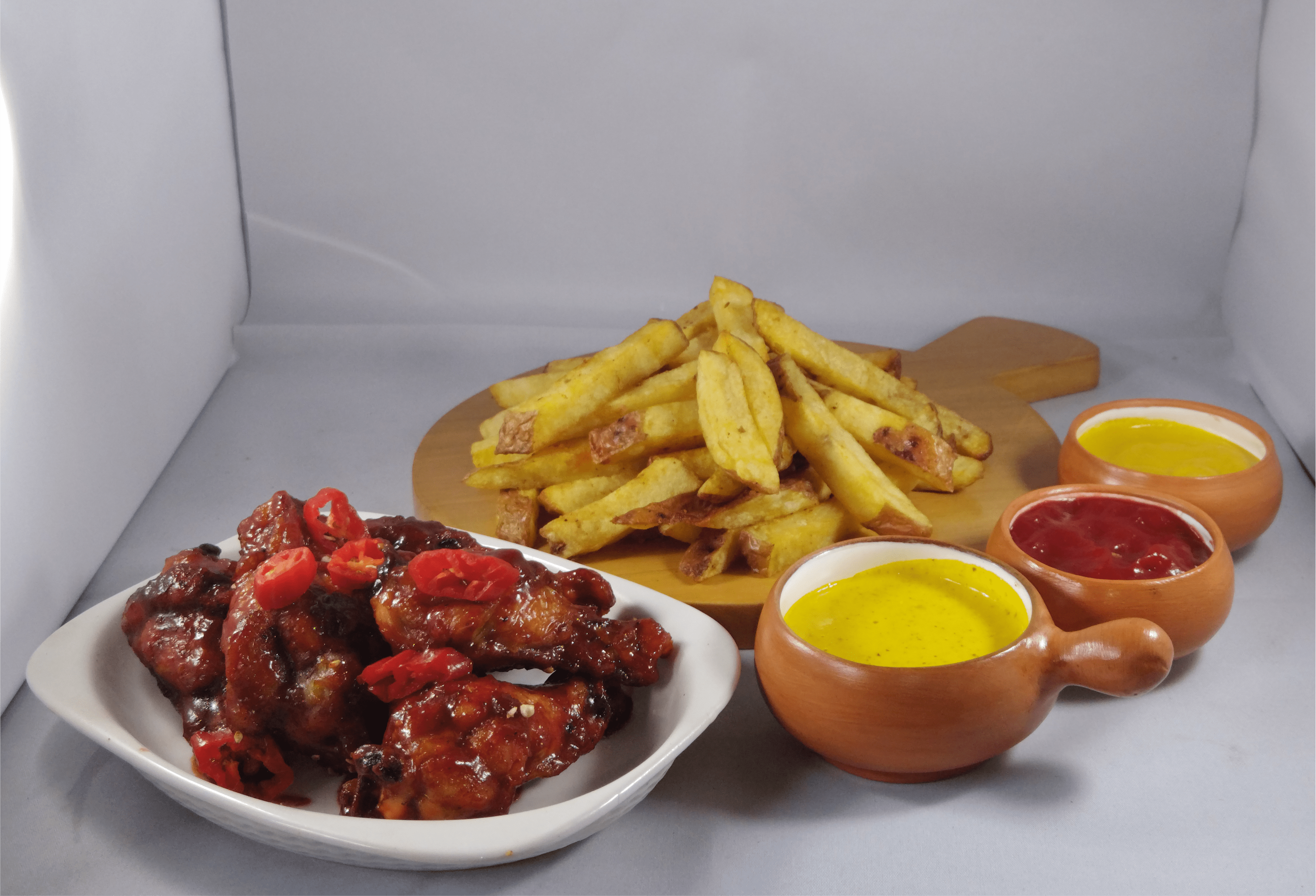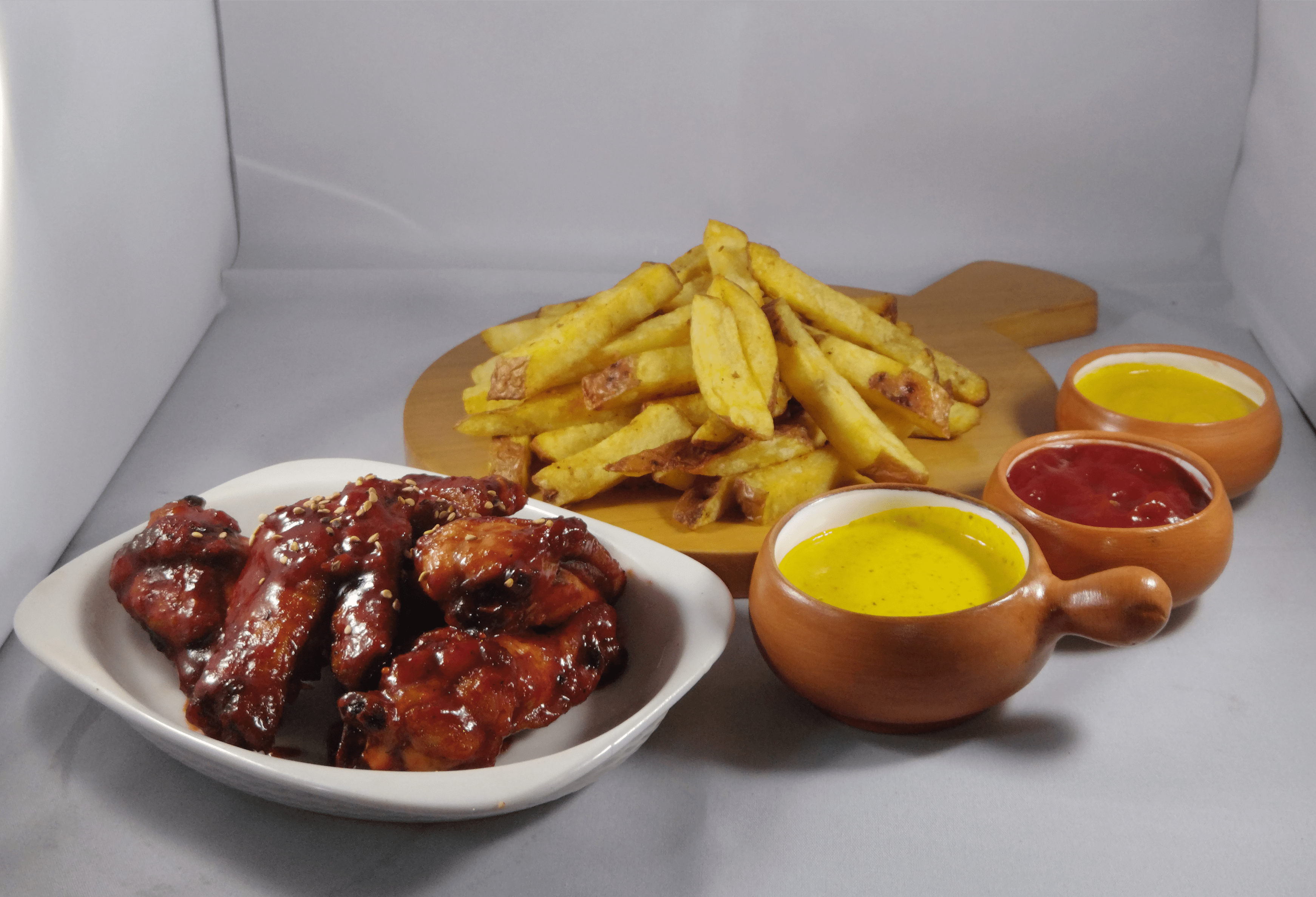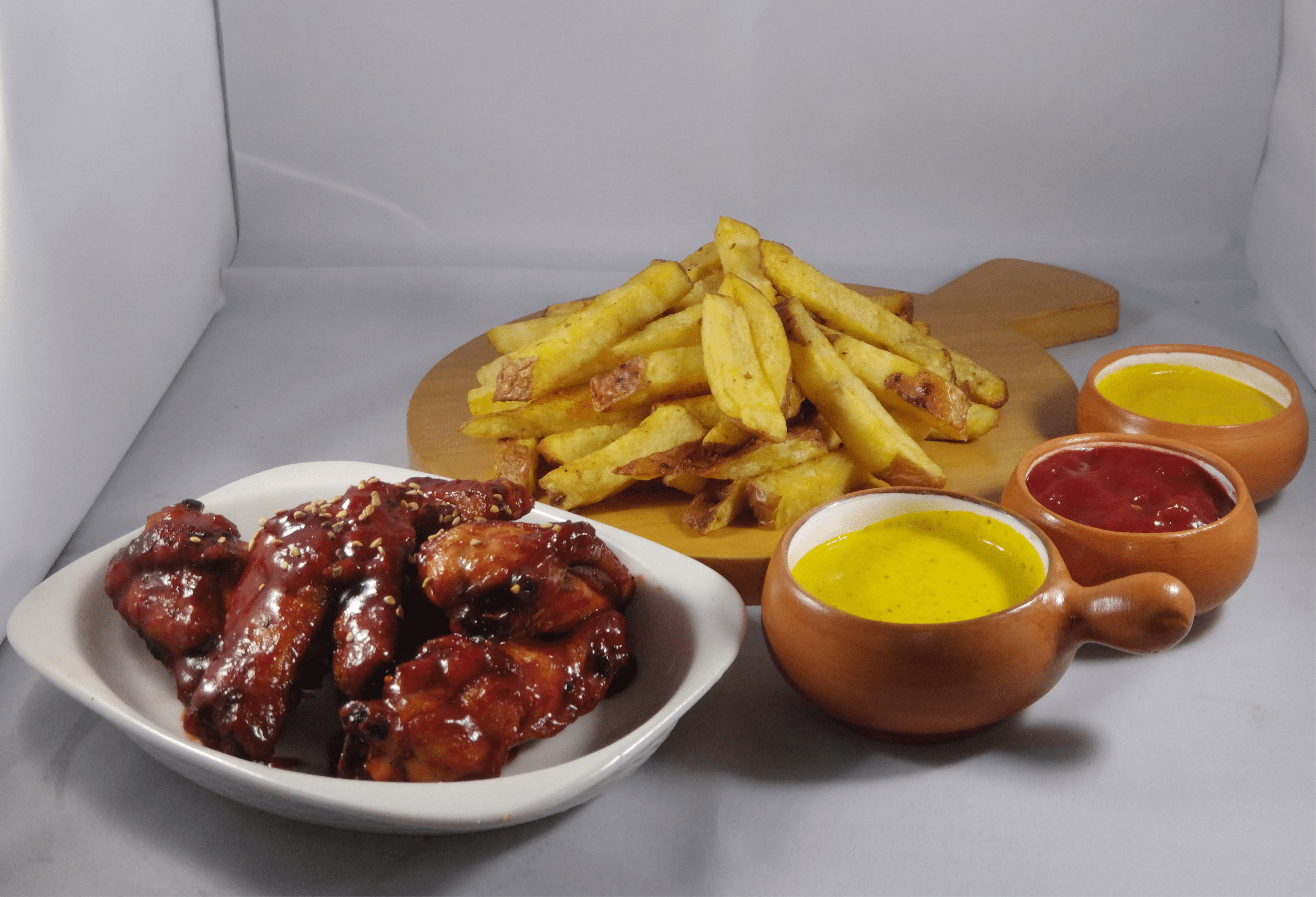 6 Alitas Fritas bañadas en una Salsa BBQ Ahumadita + Crocantes Papitas Fritas + Bebida